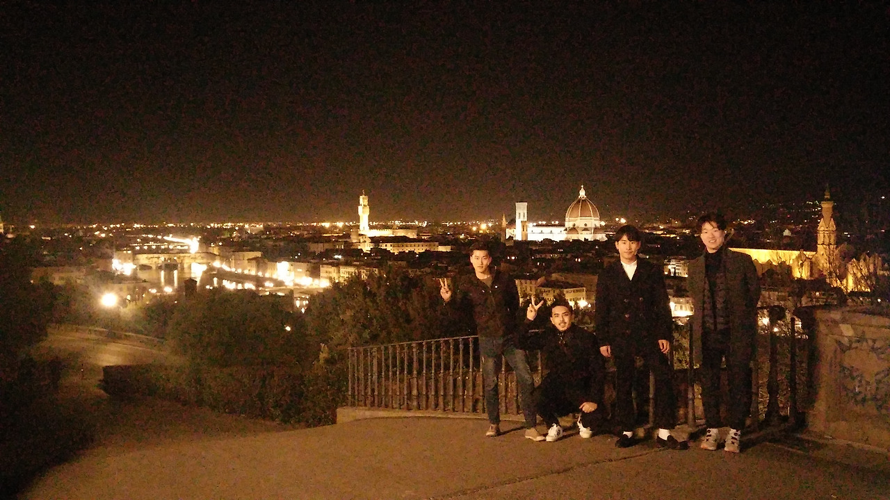 광장이 도심지 뒤편 언덕에 위치하여 사람들의 말처럼 시가지가 정말 한눈에 내려다 보였다. 주황빛 조명으로 둘러싸인 피렌체 대성당과 그 밖에 다른 건물들의 모습이 고요하고 아름다웠다. 내려다보이는 야경 뒤편에 위치한 다비드상도 조명과 함께 늠름한 모습을 보여줬다. 한참 동안이나 피렌체의 모습을 내려다보았다. 시간이 흘러 집에 돌아갈 시간이 되었다. 아쉬운 마음을 감추고 우리는 사진 하나를 남기고 다시 숙소로 돌아왔다. 피렌체의 부지런한 하루가 그렇게 지나갔다.