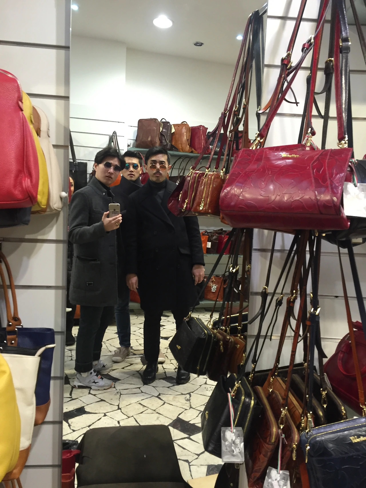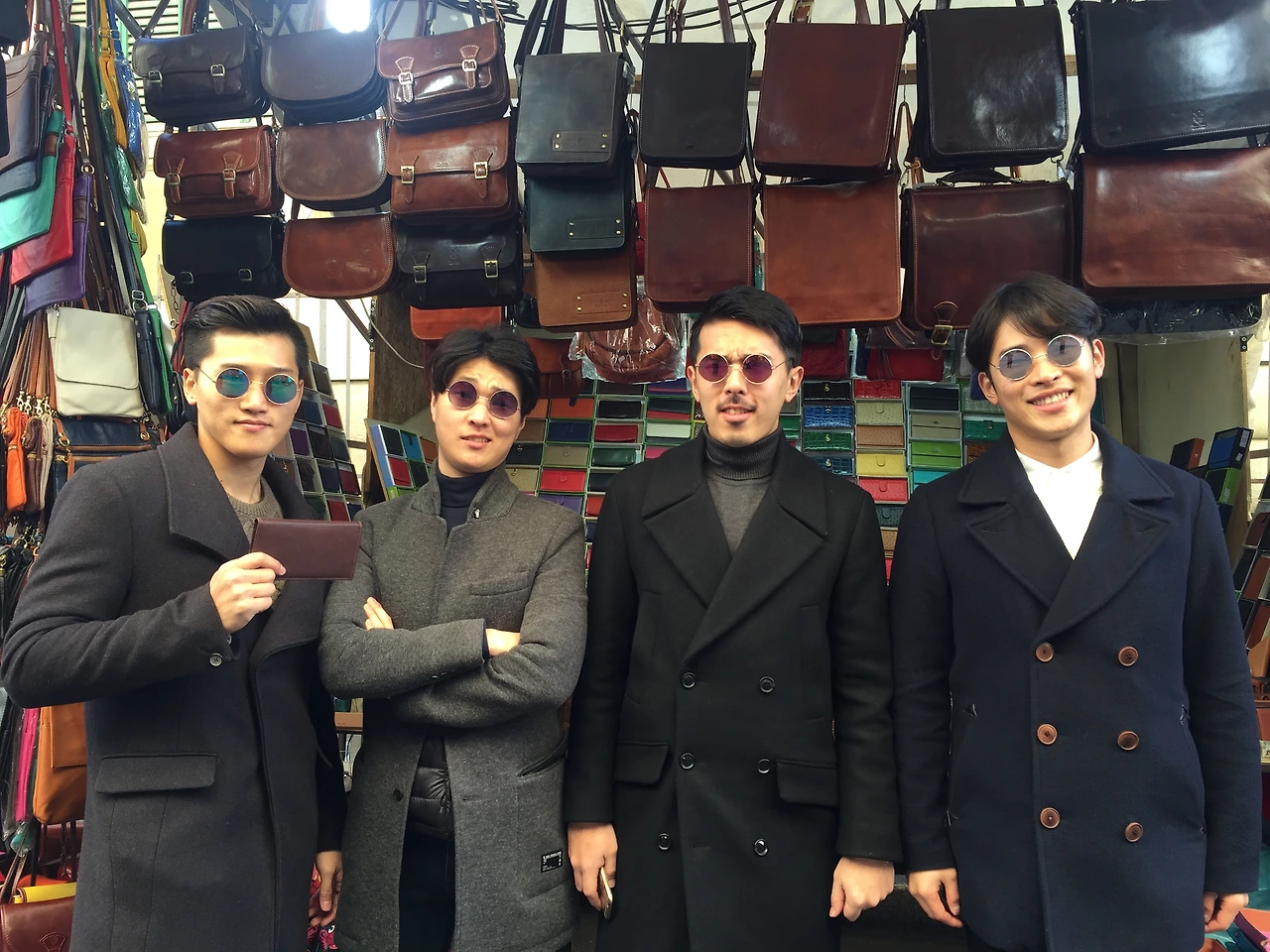 모든 쇼핑을 마치고 가죽 시장을 떠나려던 찰나 한 가판대에서 선글라스를 파는 것을 보았다. 마침 이탈리아의 햇볕이 생각보다 강렬하여 모두가 막 쓸 수 있는 선글라스를 필요로 하던 찰나였다. 선글라스의 각양각색의 색도 마음에 들었지만 무엇보다도 동그랗게 개성 있는 모습이 가장 마음에 들었다. 이 선글라스를 모두가 함께 쓴다면 어디에서든 눈에 띌 것 같았다. 가격도 저렴했기에 더 이상 주저할 이유가 없었다. 가판대의 주인께 값을 치르고 다 함께 선글라스를 써보았다. 마치 4명의 레옹과도 같은 우리의 모습이 재밌었는지 주인께서 사진을 찍어준다고 했다. 즐거운 미소로 쇼핑을 마치고 사진을 남겼다. 지금 봐도 참 재밌는 모습이다. 이후에도 여행을 하면서 가끔씩 같이 선글라스를 쓰곤 했는데 정말 주목받는 모습이었다.