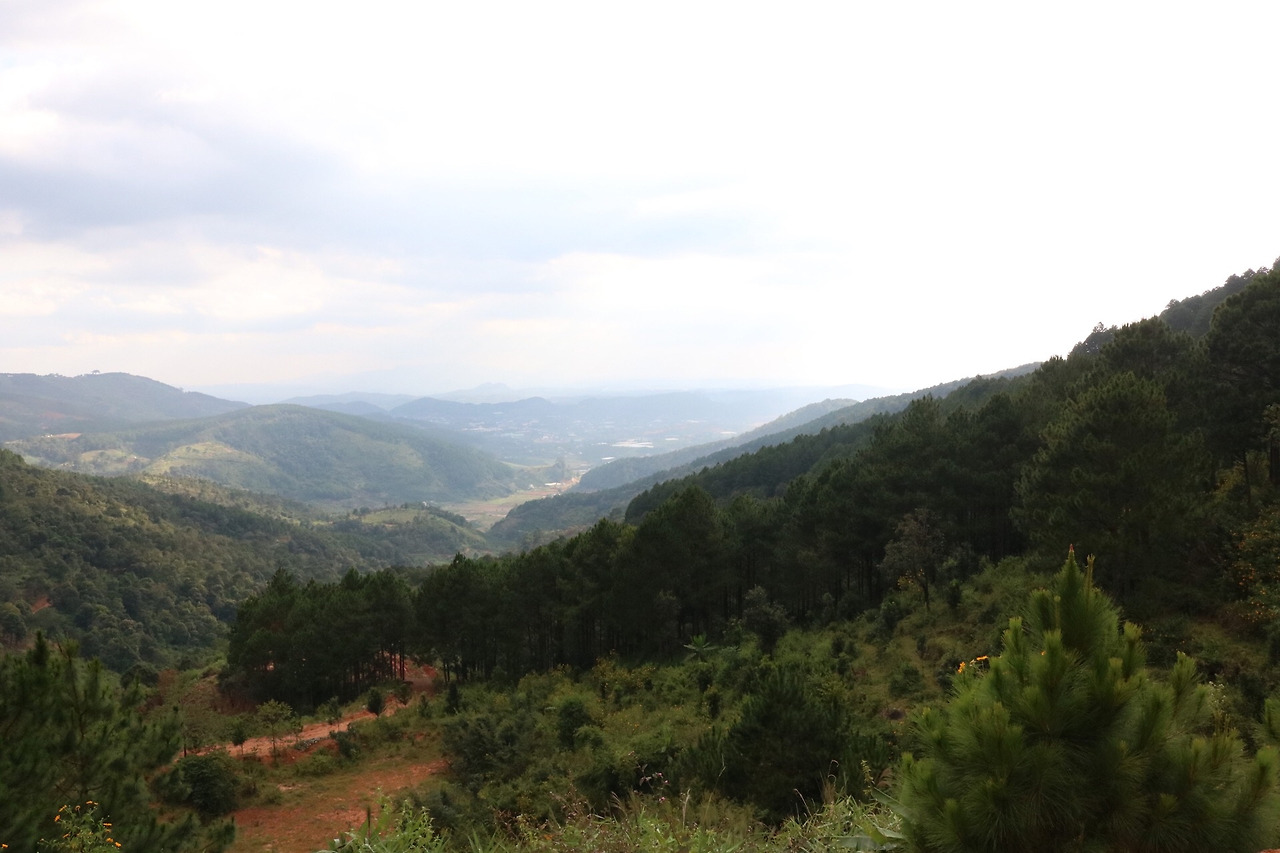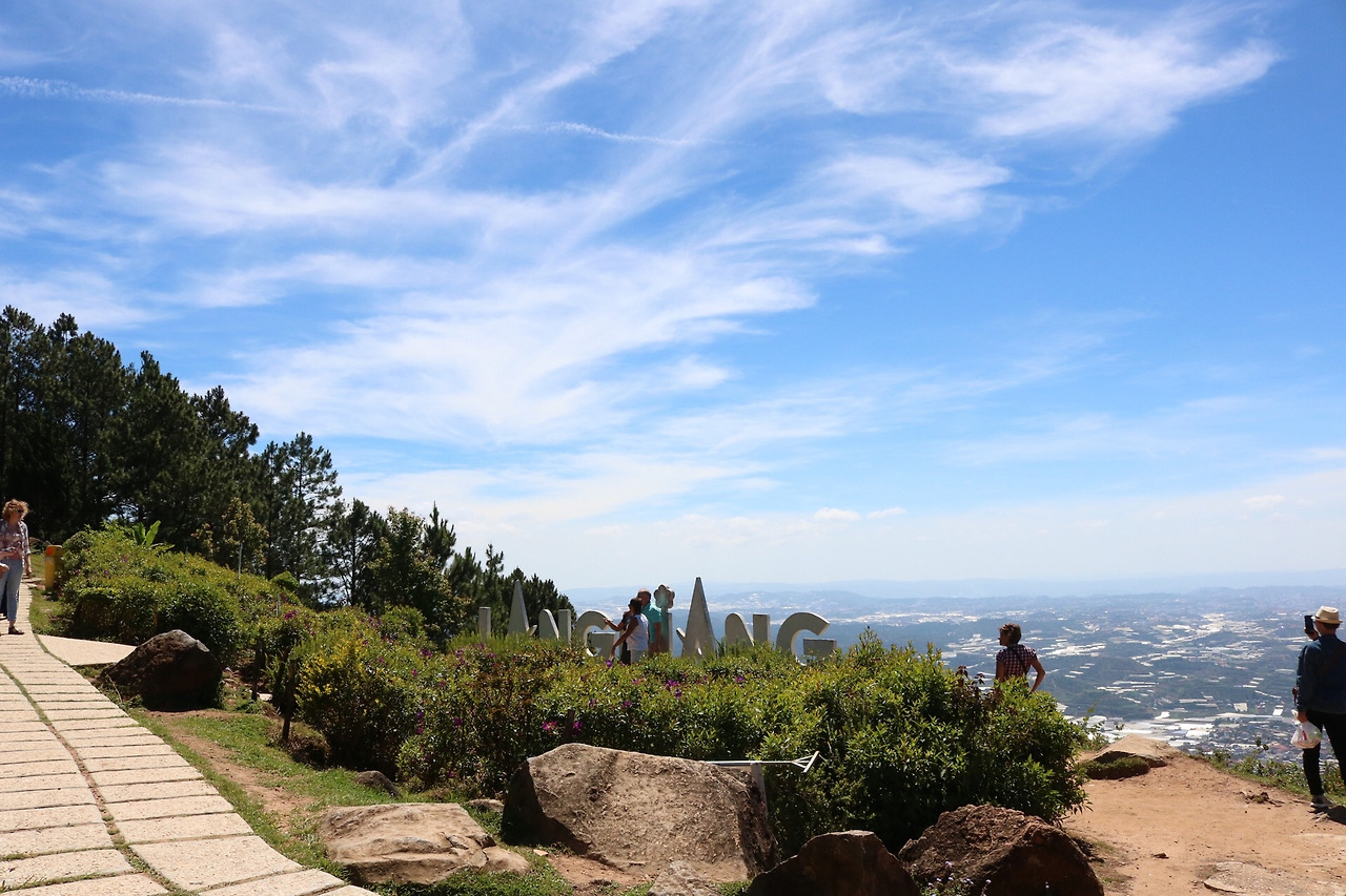 꽤 이른 아침이라 그런지 여전히 달이 떠있었다. 함께 떠있는 달과 해가 어색하지 않았다. 나뭇잎 사이로 부서지는 햇볕이 간지러웠고, 푸르는 녹음 사이로 드문드문 피어있는 들꽃들이 반가웠다. 생각했던 것보다는 산이 가파르고 아스팔트 길로 계속되어있어 오르는 것이 쉽지는 않았지만 올라갈수록 드넓게 펼쳐지는 달랏의 풍경에 위로가 되었다. 뿐만 아니라 지프차를 타고 올라가는 다른 여행객들이 손을 흔들며 전해준 인사도 힘이 되었다. 풍경과 함께 걷는다는 것은 신기하다. 음악을 들으며 올라가는 이 길과 내 눈동자에 담기는 모든 풍경들이 한 편의 영화처럼 기억 속에 저장되었다. 올라가는 도중 흙길로 된 등산로가 있었지만... 혹시라도 길을 잃을까 함부로 도전해보지 못했다. 동행인이 한 명이라도 있었다면 아마 그 길도 경험해볼 수 있지 않았을까. 이런저런 생각들을 하는 도중, 드디어 랑비앙 산 정상에 도착했다.