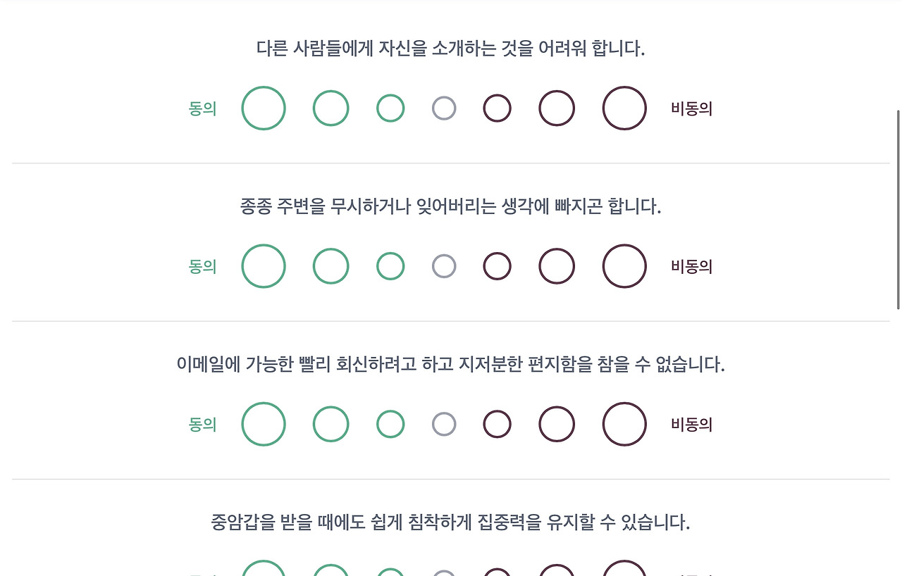 어쨌든 HR 부서의 일원으로써 구성원들을 대상으로 이런저런 성격유형 검사를 시행하기 전 늘 우리 자신을 대상으로 먼저 검사를 진행할 필요가 있었다. 그리고 검사가 가지고 있는 특징들을 이해하고 나의 결과를 바라보니 이전과는 달리 객관적인 시선으로 바라볼 수 있었다. 검사 결과를 맹신하는 것이 아니라 이 검사가 나타내는 나의 모습 중 받아들이고 더 나아지기 위해 개선해야 되는 점 혹은 아직 발현되지는 않았지만 내가 가지고 있을 수 있는 나의 강점 등을 재해석할 수 있었다. 검사 결과가 내가 생각하는 모습과 다를 수 있다. 혹은 너무 객관화되어 적나라한 모습에 불편함을 느낄 수도 있다. 결국 중요한 것은 검사 결과 그대로를 나 자신이라고 규정짓는 것이 아니라 스스로를 객관화하여 제 3자의 시선으로 담백하게 바라보는 것이었다. 그 과정에서 취할 것은 취하고 흘려버릴 것은 흘려버리면 되었을 뿐이었다.