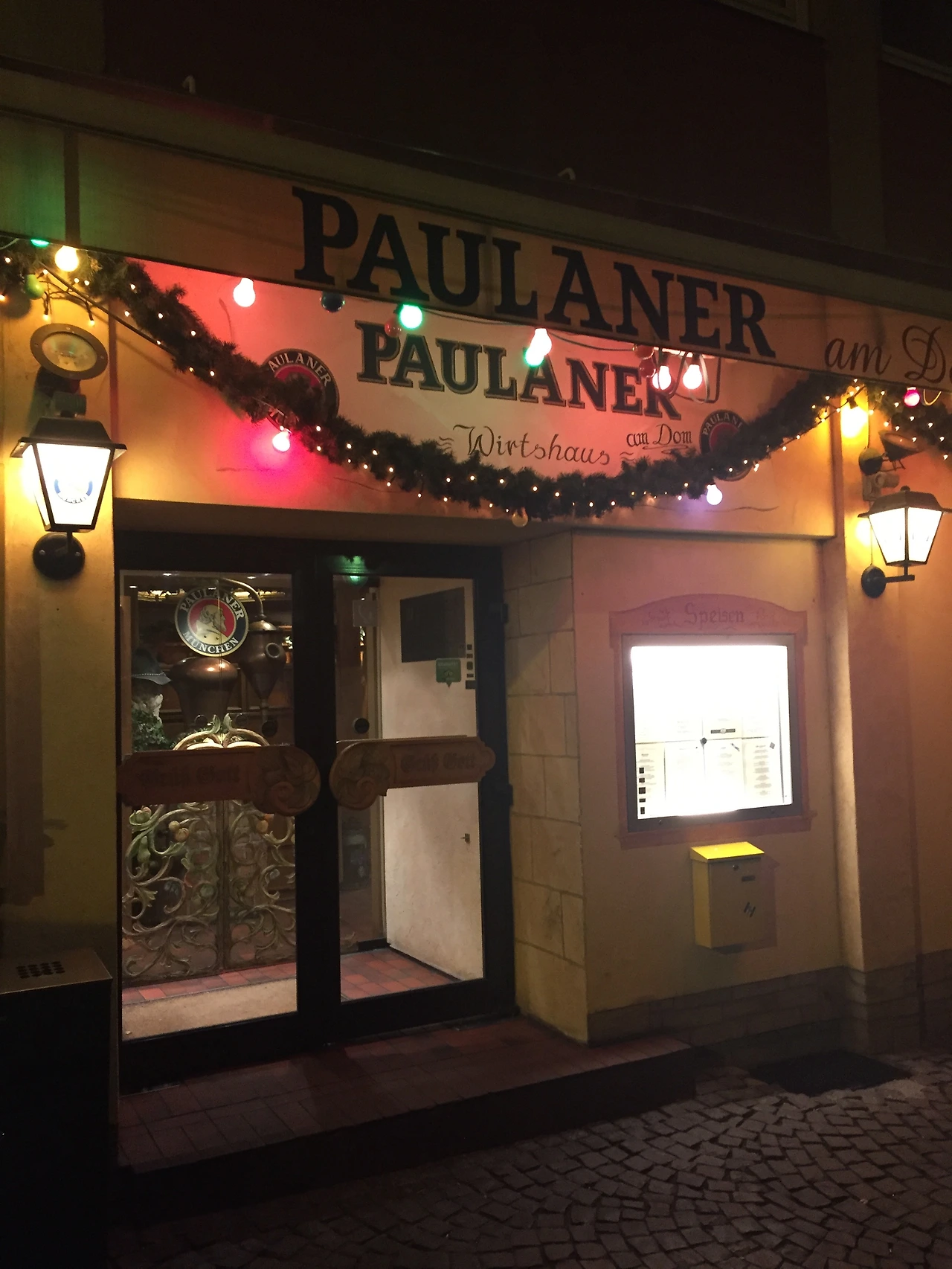 프랑크푸르트에서의 저녁식사는 현지에서 살고 있는 친구가 추천한 맛집에서 가졌다. 식당의 이름은 파울라너(Paulaner am Dom)였고, 맥주 브랜드 파울라너와 무슨 관계가 있나라는 생각이 들었다. 유럽 여행에서 기억에 남는 음식이 그렇게 많지는 않지만, 이곳의 학센은 아직도 가끔 생각난다. 그만큼 만족스러운 학센이었고 파울라너 맥주도 굉장히 맛있었다. 현지 맛집이라는 것을 증명하듯 한국어는 찾아볼 수도 없었을뿐더러, 독일의 전통적인 분위기가 느껴지는 디자인으로 인해 이국적인 느낌이 더 강해졌다. 학센뿐만 아니라 슈니첼도 먹었는데 오스트리아에서 먹었던 오리지널 슈니첼보다는 훨씬 입맛에 맞았다. 오리지널 슈니첼은 레몬즙 이외에는 소스가 전혀 없어 심심한 느낌이었지만, 이 곳의 슈니첼은 버섯 소스가 가미되어 좀 더 돈가스 같은 느낌이 들었다. 훌륭한 식사를 마치고, 광장에서 따뜻한 뱅쇼를 마시며 새롭게 만난 친구와 시간 가는 줄 모르게 긴 얘기를 나누었다. 날은 비록 차가웠지만, 따뜻함이 느껴지는 밤이었다.
