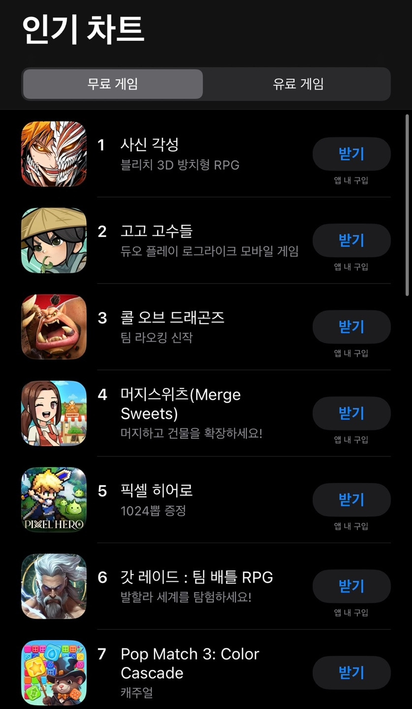대부분 캐주얼한 방식의 게임이 상위에 포진되며,