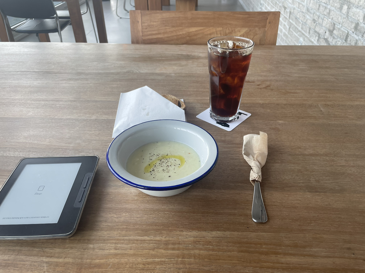 혼자 하는 여행의 묘미 중 하나는 낯선 사람과 나누는 대화다. 자리에 앉은 지 삼십 분쯤 지나니 어느새 혼자 온 사람들이 바 테이블을 채웠다. 나는 테이블에 카메라를 올려두고 있었고, 왼쪽에 앉은 이는 책을 읽었다. 어떤 책일지 무척 궁금했다. 책 읽기를 좋아하는 사람들은 마찬가지이지 않을까? 남이 읽는 책이 무슨 책일지 너무 궁금한 마음 말이다. 책 읽는 이를 방해할 생각은 없었기에 나대로 그 공간을 즐기고 있었다.