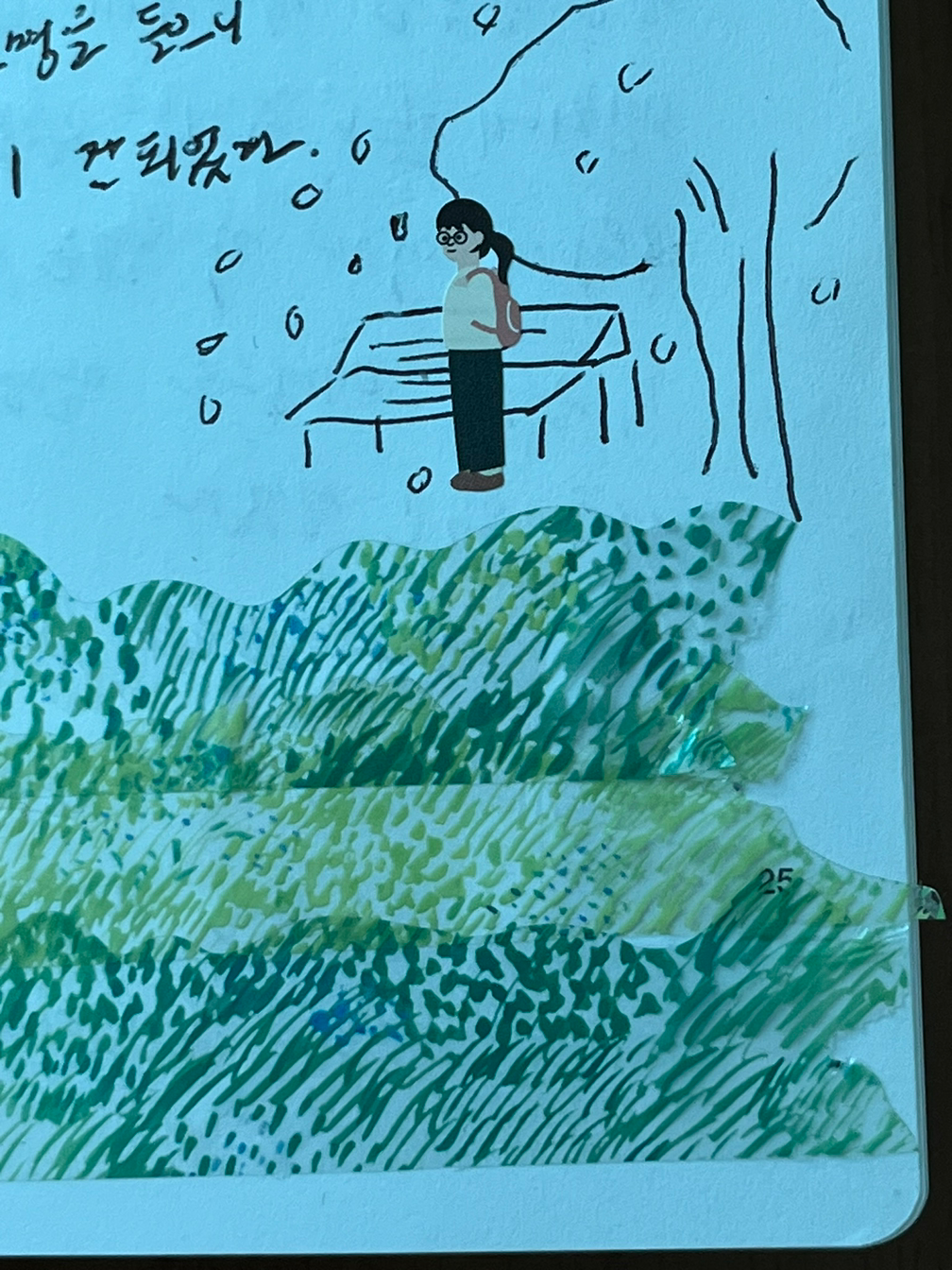 키가 큰 어두운 카키색 나무들이 빼곡히 공원을 감싸고, 그 안으로 민트, 연두, 올리브 등 세상 모든 초록 계열의 나무들이 다른 모양을 한 채, 움직이지 않는 그림 같은 모습으로 서있다. 호수는 나무들로 인해 아주 진한 녹색이 비치고, 나는 본 적 없는 영화 <기쿠로지의 여름> 속 유명한 음악, summer를 재생하고 싶어진다. 공원을 찾은 다른 사람들도 여름의 녹음에 취해있다. 나 또한 이 아름다운 풍경을 계속해 보고 싶다고 생각한다. 우리는 각자 다른 나라에서 살고 있지만 나란히 앉아 한참이나 같은 곳을 바라본다. 이런 경험을 한다는 것이 뭉클하게 느껴졌다. 주체할 수 없는 미운 날씨마저 이기는 건 여름에만 볼 수 있는 이런 풍경일 테다. 걸을 때마다 나무 사이에 비를 머금은 물방울이 떨어져 옷은 금방 축축해지고, 높은 온도 때문에 금세 땀범벅이 되었지만 벗어나고 싶다는 생각은 조금도 안 한다.
