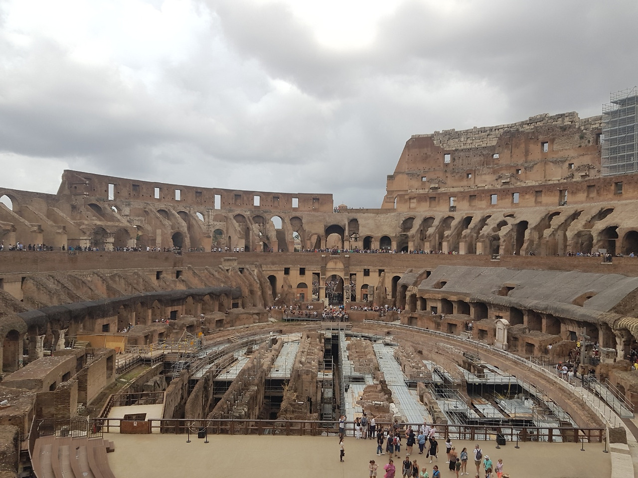 하루쯤은 비가 올법한데도 불구하고 밖에 나가면 화창한 날씨와 함께 여행을 시작했다. 그런데 내일은 폭우가 온다는 것이다. 마지막 날인데....... 그래도 비가 와서 선선한 게 낫지 하며 조원들끼리 위로의 말을 건넸다. 드디어 당일이 되었다. 긴장을 하고 밖으로 나섰는데 비가 그치고 날씨도 선선하니 딱 좋았다. 호텔에서 로마 시내까지 무료 셔틀버스를 운행하여 9시 30분에 맞춰서 나갔다. 그런데 10분이 지나도 버스가 도착할 생각을 하지 않아 로비에 물어보니 조금 더 기다리라는 것이었다. 그렇게 30분이 넘어서도 도착하지 않았고 1시간이 되어서도 감감무소식이었다. 우리는 콜로세움 통합 권을 미리 구매하였기에 오전 11시까지 콜로세움에 도착해야 했다. 그래서 어쩔 수 없이 우버를 타고 콜로세움으로 향했다. 다행히 시간 맞춰서 내렸고 30분 정도 왔을 때의 요금은 한 사람당 6유로의 금액이 들었다. 총 7명이 탔으니 42유로, 5만 원이 넘는 금액이었다. 역시 유럽 물가 비싸다. 그렇게 콜로세움으로 걸어갔고 성수기라서 많은 사람들이 기다리고 있었다. (성수기에는 반드시 티켓을 인터넷으로 예매하기를 바란다.) 통합 권을 미리 구매하였기에 기다리지 않고 내부로 바로 들어갈 수 있었다.