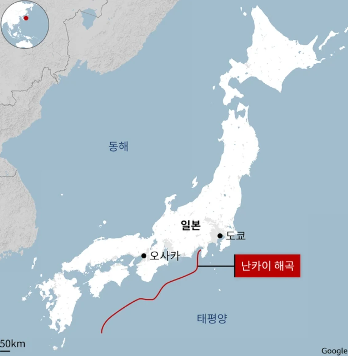 난카이해곡은 아래 그림과 같이 일본 혼슈 남쪽에 있는 해곡인데 난카이트로프라고도 불린다.