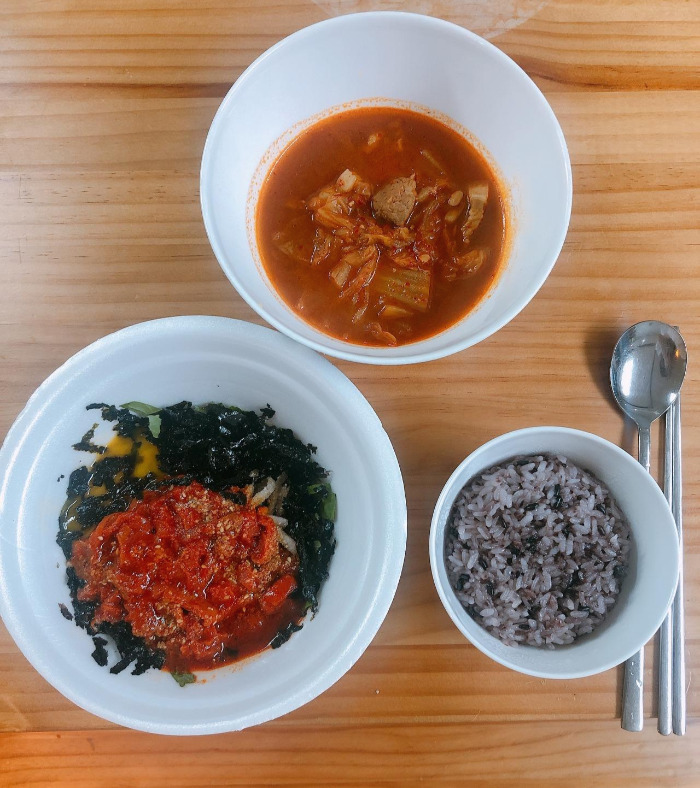 오늘은 특별히 친구가 끓여준 김치찌개가 식탁에 올랐다. 맛대장 육회비빔밥과 함께.