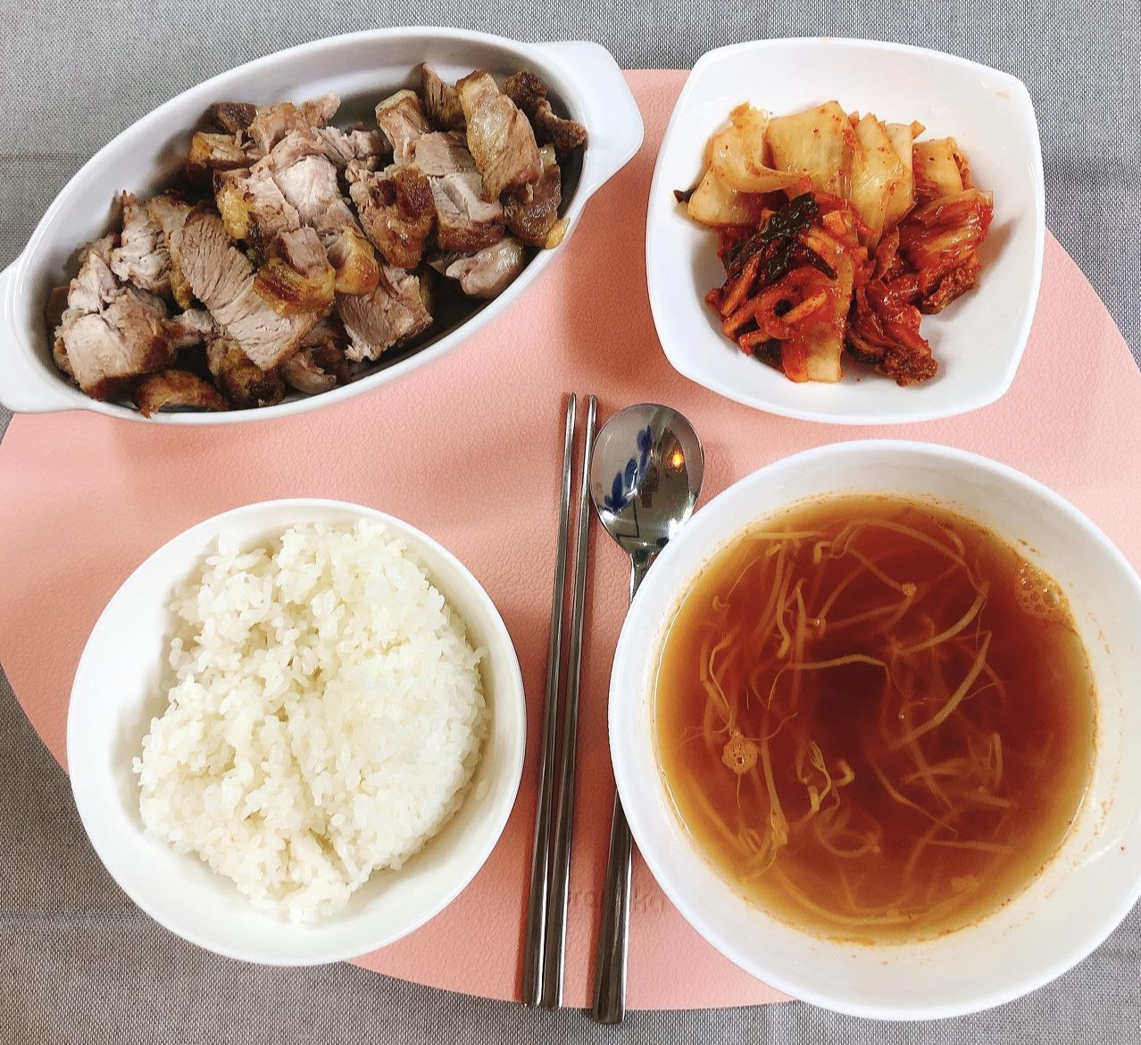 빗살무늬토기가 구석기에서 신석기로의 발전을 보여주는 상징물이라면, 에어프라이어 또한 문명의 한 축을 담당하지 않을까. 이것은 레볼루션, 혁명이다. 어떻게 수육을 이렇게 냄새 없이, 심지어 겉바속촉으로 조리할 수 있을까. 연신 에어프라이어에 감탄하다가 국을 놓쳤다. 결국 냉장고를 뒤져 찾아낸 숙주로 국을 급조했다.