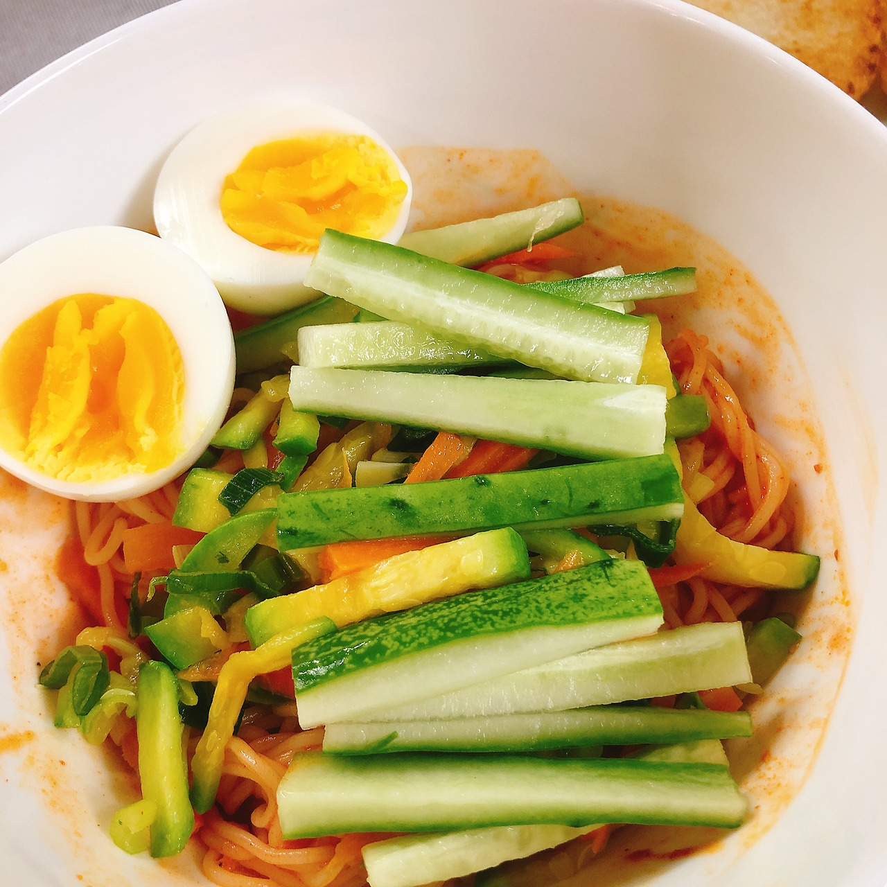 토마토(1/2개), 오이(원하는 만큼), 각종 채소(나는 애호박과 당근), 달걀, 소면