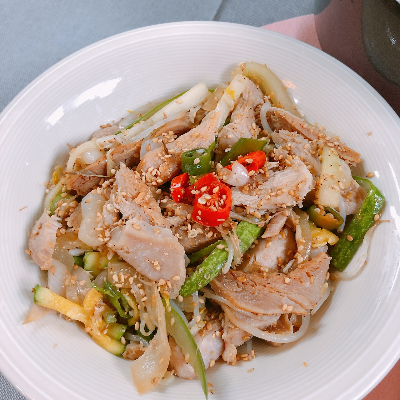 숙주 잡채 재료 : 숙주(3줌), 닭가슴살(500G), 피망(1), 오이(2), 양파(1), 나는 애호박(1/3), 당근(1),