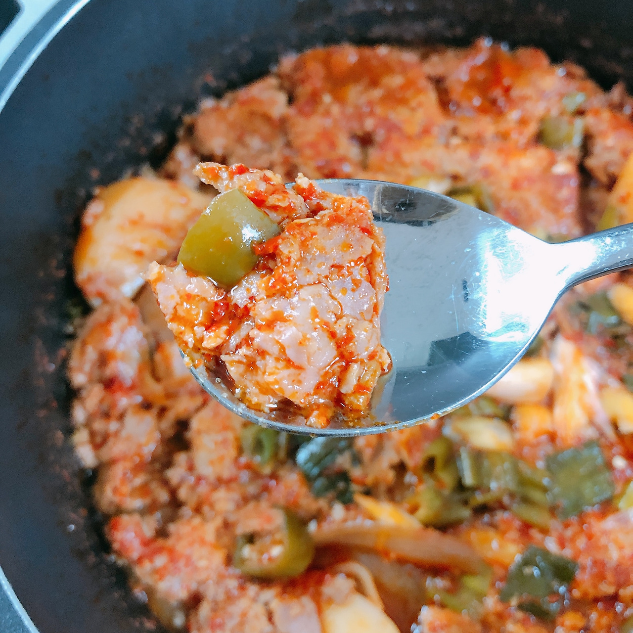 양념 : 다진 마늘(1), 고추장(1), 설탕(1), 고춧가루(2), 간장(4), 된장(1/2), 물(700~800ML)