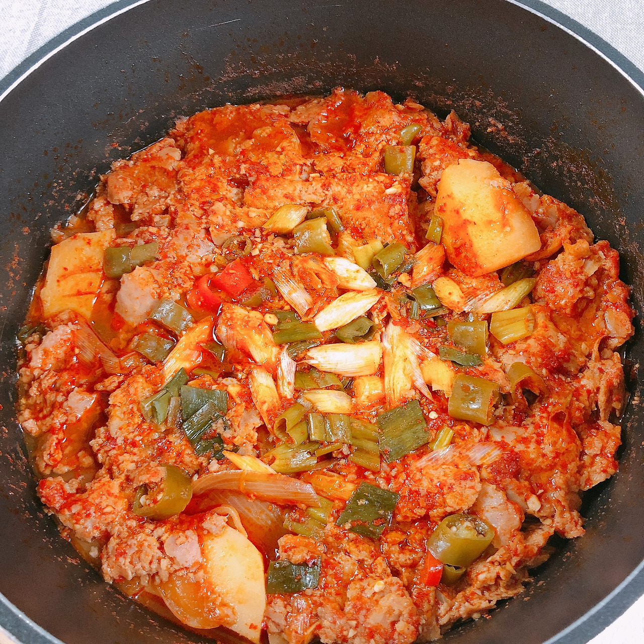 감자 짜글이 재료 : 감자(2), 양파(1/2), 대파(큰 줄기 1), 통조림 햄(1), 청양고추(FREE)