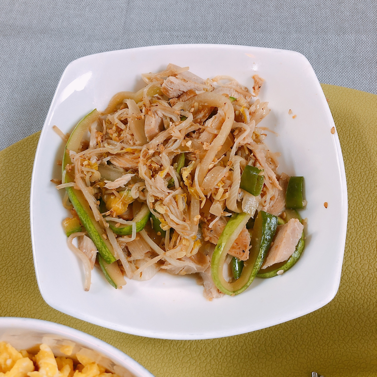 달걀은 3개 풀어서 달걀 알끈 제거하고(요거요거 비릿하다 꼭 제거하자) 섞어서 달궈진 프라이팬에다 촤르륵 뿌리고 약불에서 마구마구 망쳐서 스크램블 에그를 만들자. 망친다고 생각하는 것이 뽀인트. 익힘 정도는 취향껏!
