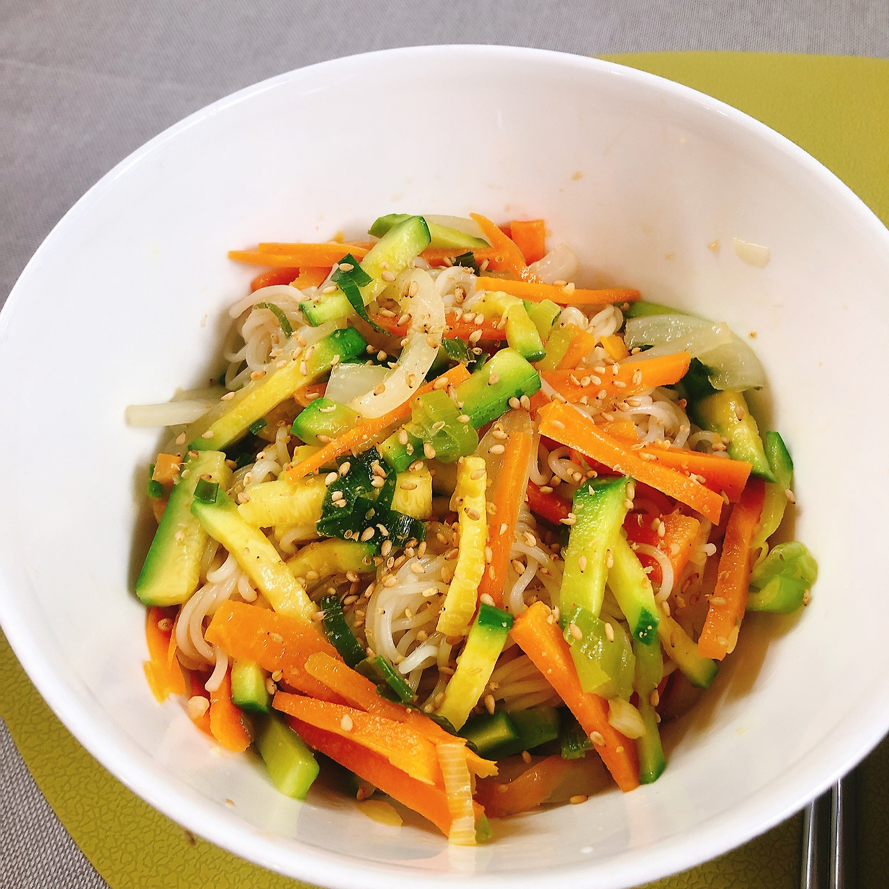 그릇에 소면과 채소를 담고, 양념을 넣어 쉐킷쉐킷 오른손으로 비비고 왼손으로도 비비면 완성!