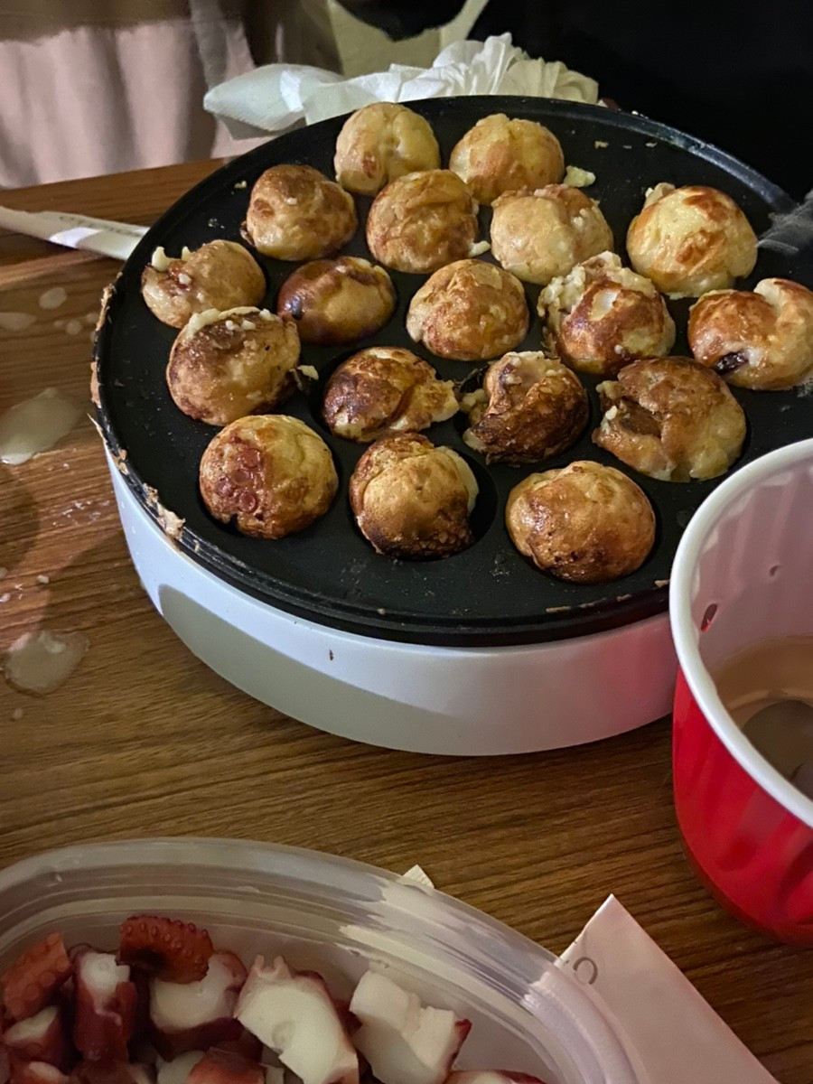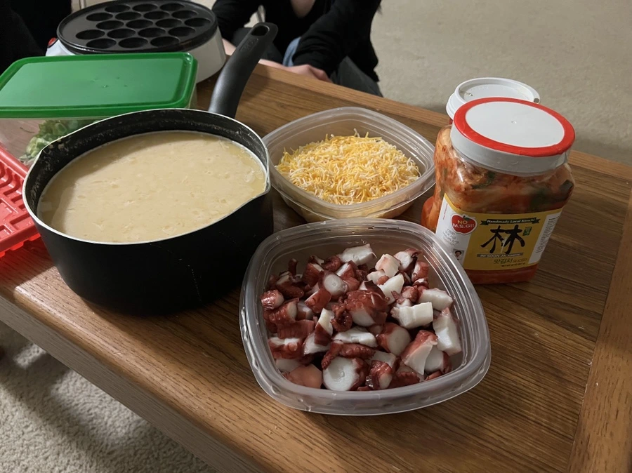 다른 어떤 친구는 부모님이 타코야끼 가게를 운영하셨다고 했다. 아시아 친구들이 모두 모여 타코야끼와 오꼬노미야끼를 만들어 먹는다. 여기에 개인의 기호에 맞춰서 김치, 오징어, 치즈를 넣고는 타코야끼를 뒤집는다. 타코야끼나 오코노미야끼를 만드는 모든 과정과 재료를 알 수 있었고, 일본의 문화를 알 수도 있었다.