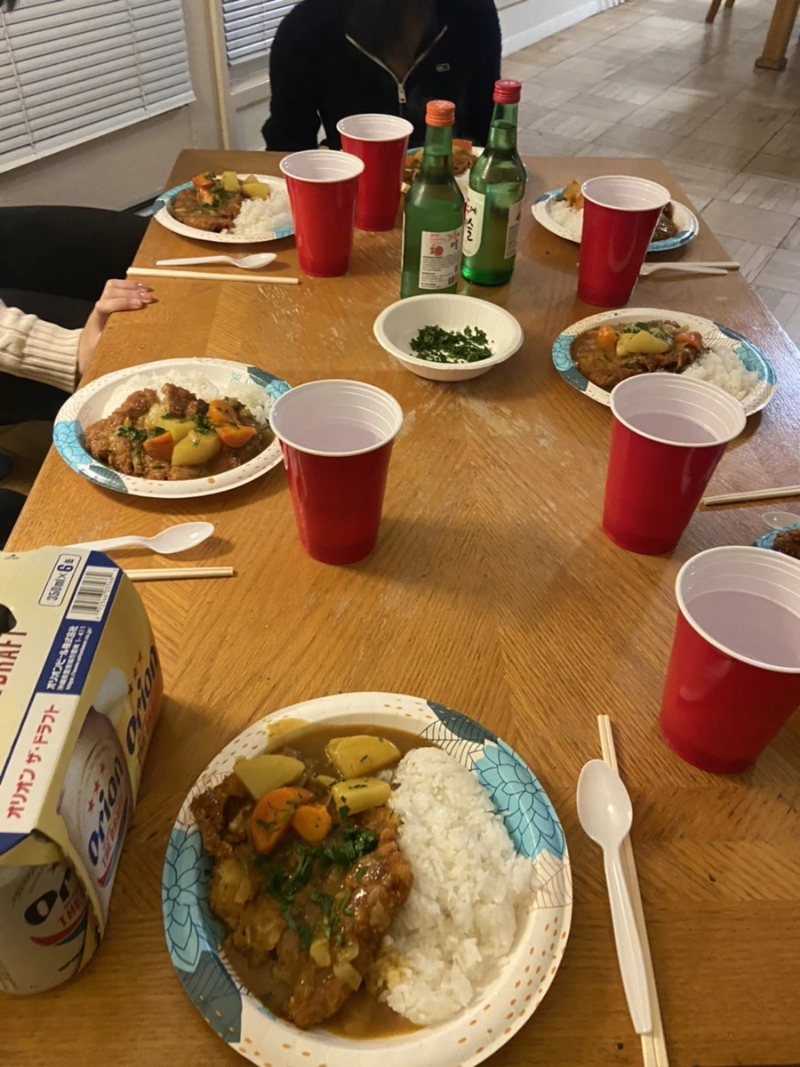 카레를 푹 삶고 돈가스를 위의 박자에 맞춰서 튀긴다. 손은 밀가루 범벅이 되어서 닭발 같아졌다. 음식을 만드는 내내 일본과 미국 친구들에게 일본어나 슬랭을 배운다. 뿐만 아니라 서로의 문화를 공유하고 노래를 번갈아가면서 고른다. 2시간에 걸쳐 돈가스 카레를 조리했고 맛은 부드럽고 맛있었다.