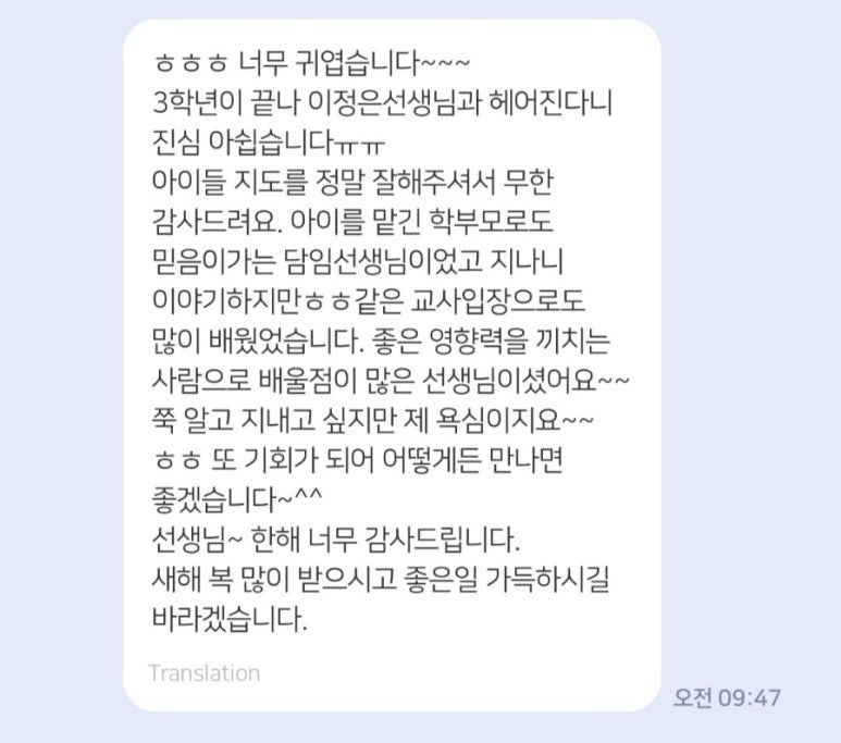 종업식날, 여러 분이 감사메시지를 보내주셨다. 하지만 그중에서도 더욱 진심이 느껴지는 분들은 역시나 독서모임 어머니들이셨다. "학부모가 아닌 사람으로 해주세요."라는 말에서 웃음이 났다. "기회가 되어 어떻게든 만나면 좋겠습니다."의 말에서 우리가 얼마나 진한 사이가 되었는지 느낄 수 있었다.