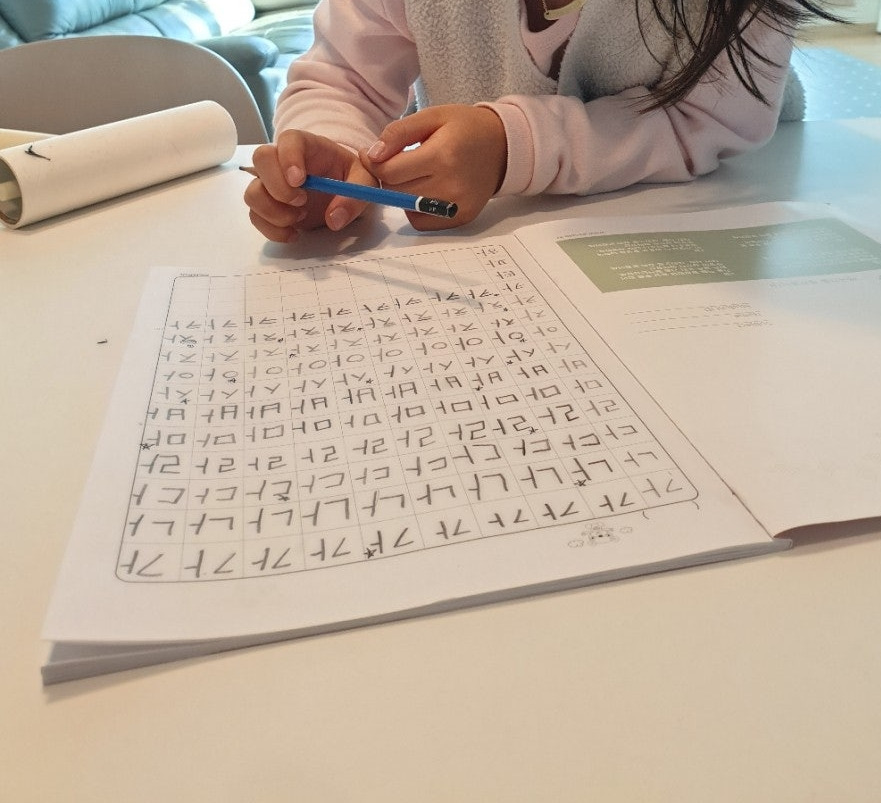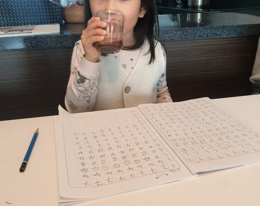 딸은 재미있다며 글씨 쓰기를 계속하고 싶다고 했다. 이 마음이 사라질까 봐 얼른 10칸 공책을 장만했다. 아이가 배움에 열의가 있을 때 시작하는 게 좋기에 내 생각보다는 조금 일찍 한글 쓰기 공부를 시작하게 되었다.