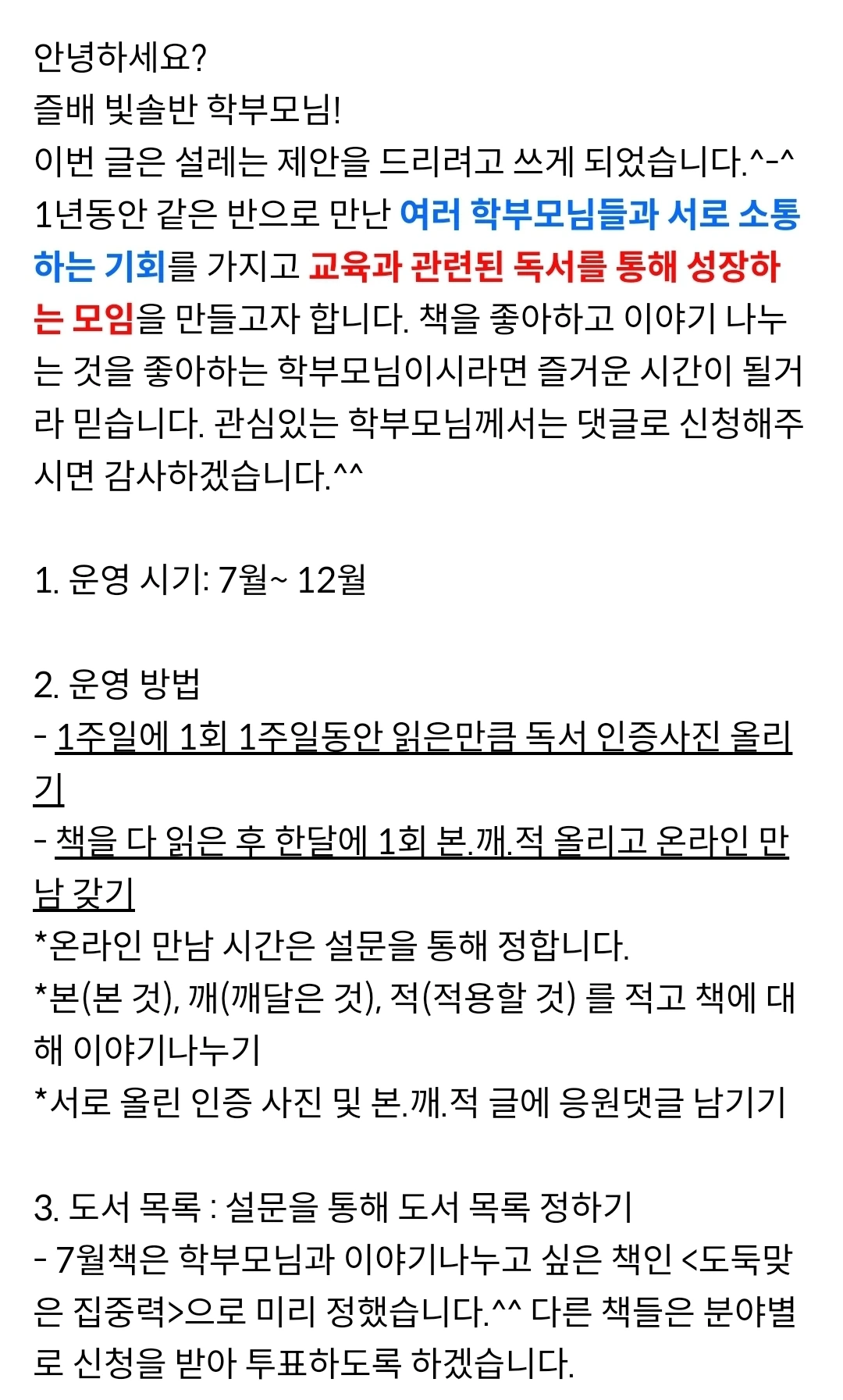 고민 끝에 학급 알림장에 <빛솔반 독서모임> 모집글을 올렸다. 나는 우리 반 학부모님과 함께하는 독서모임에 도전한 것이다.