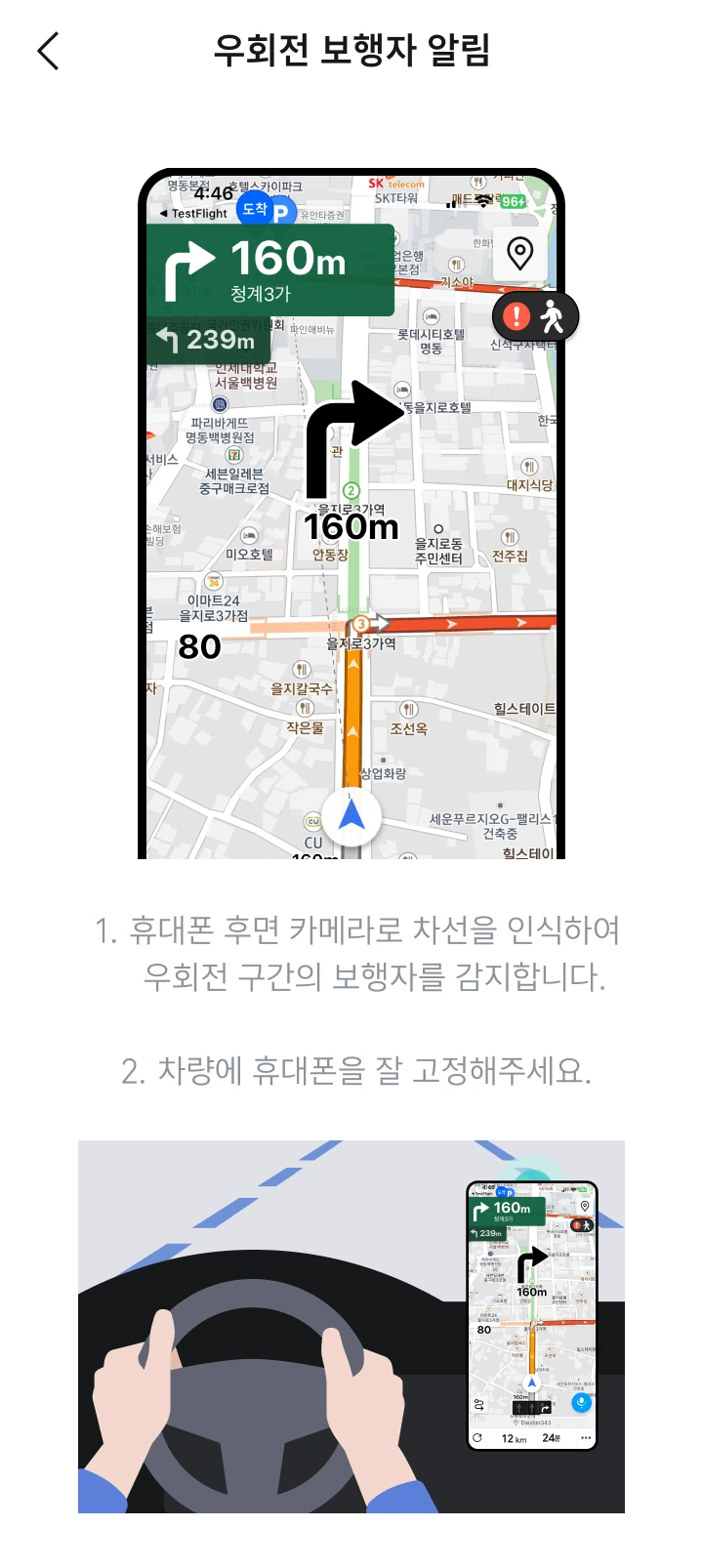 현재 관련 기능은 TMAP iOS 버전에서 우회전 보행자 알림이라는 이름으로 실험실 기능으로 추가되어 있습니다. 본문에서 설명드린 몇 가지 기능은 추후 보완/개발되어 추가 예정입니다.