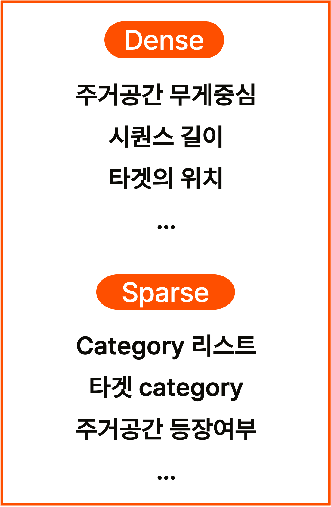 데이터는 그 특징을 기준으로 dense와 sparse로 분류되어 학습됩니다. Dense란 값의 대소관계를 내포하는 데이터로 길고 짧음, 크고 작음을 표현하는 데이터입니다. 시퀀스 길이, 타겟의 위치 등이 이에 해당합니다. Sparse란 값 자체가 의미를 가지지 않는 데이터로 인덱스 정보로 사용되는 데이터입니다. 타겟 poi의 카테고리 정보나 주거공간의 등장 여부등이 여기에 해당합니다.