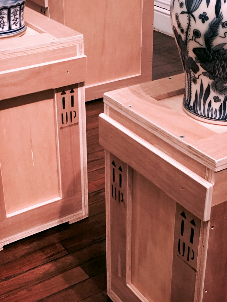 사진을 보면 알 수 있듯, 작품을 운송할 때 쓰이는 목상자를 의도적으로 작품과 함께 전시하고 있다. 사물이 원래 있던 시간과 공간을 벗어나 박물관에 전시되는 유물이 되면서, 사물의 본래 가치와 우위가 변화하는 것을 표현한 것이다.