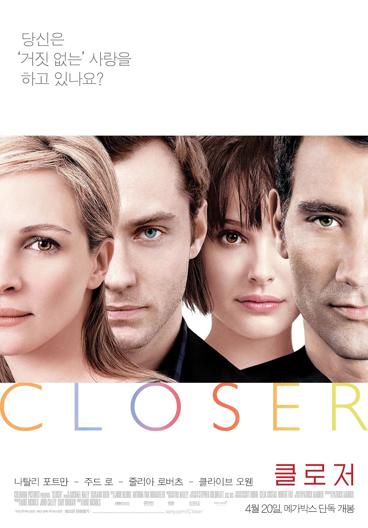 대도시의 길거리에서 'Hello, Stranger? (헬로, 스트레인저?)'라고 하는 대사로 유명한 <클로저>는 몇 년의 시간 차를 두고 변해버린 관계에 대해 이야기하는 영화다. 다소 시간적, 공간적 이동이 있기는 하지만 주요 공간은 손가락으로 꼽을 수 있을 정도로 제한적이며 거의 실내 공간이다. 연극적인 영화라고 할 수 있다. 실제로 원작이 동명의 연극이며, 문근영이 대학로에서 해당 연극을 공연한 적도 있다. 내가 직접 연극을 보지는 않았지만 각색을 많이 하지 않고 만들어진 영화라는 것이 느껴진다. 그도 그럴게 감독인 패트릭 마버는 연극 클로저의 작가이기도 하다.