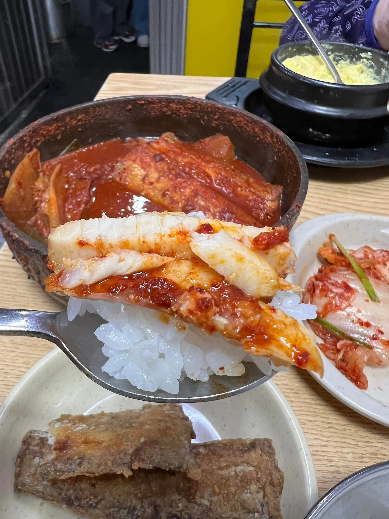 생각에 잠겨 있다가 부글부글 끓는 갈치조림 뚝배기를 받아들고선 바느질을 하듯 뼈를 발라내 수저 위에 한 가득 하얀 갈치 살을 얹는다.