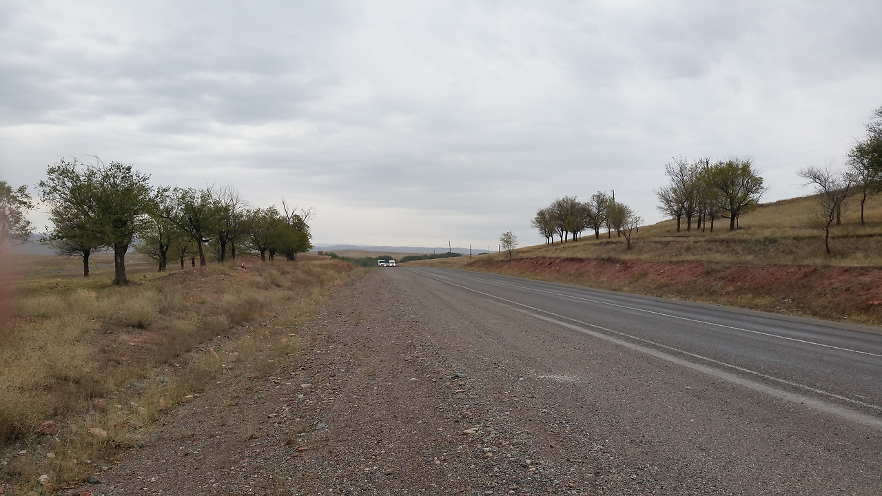 날씨가 갑자기 쌀쌀해졌다. 출발하기 전날까진 해가 쨍쨍했는데 말이다. 비가올 것 같기도 하다. 카자흐스탄 현지 친구가 했던 말이 생각난다. 여기는 10월부터 눈이 오기 시작해서 이듬해 4월까지 눈이 온다고. 기온은 영상 10~15도 사이였는데, 갑자기 눈이 올 것 같은 생각은 들지 않았다. 하지만 키르기즈스탄에서 돌아온 후, 한낮에 15도였는데 갑자기 눈이 내리면서 영하 10도가 됐던 것이 기억난다. 아무튼 돌이켜 보면 여행 갈 때 날씨 운은 그렇게 좋은 편이 아닌 것 같다. 도로 위에는 관광객을 태운 것으로 추정되는 벤과 버스, 물류 차량만이 지나다니고 있다.