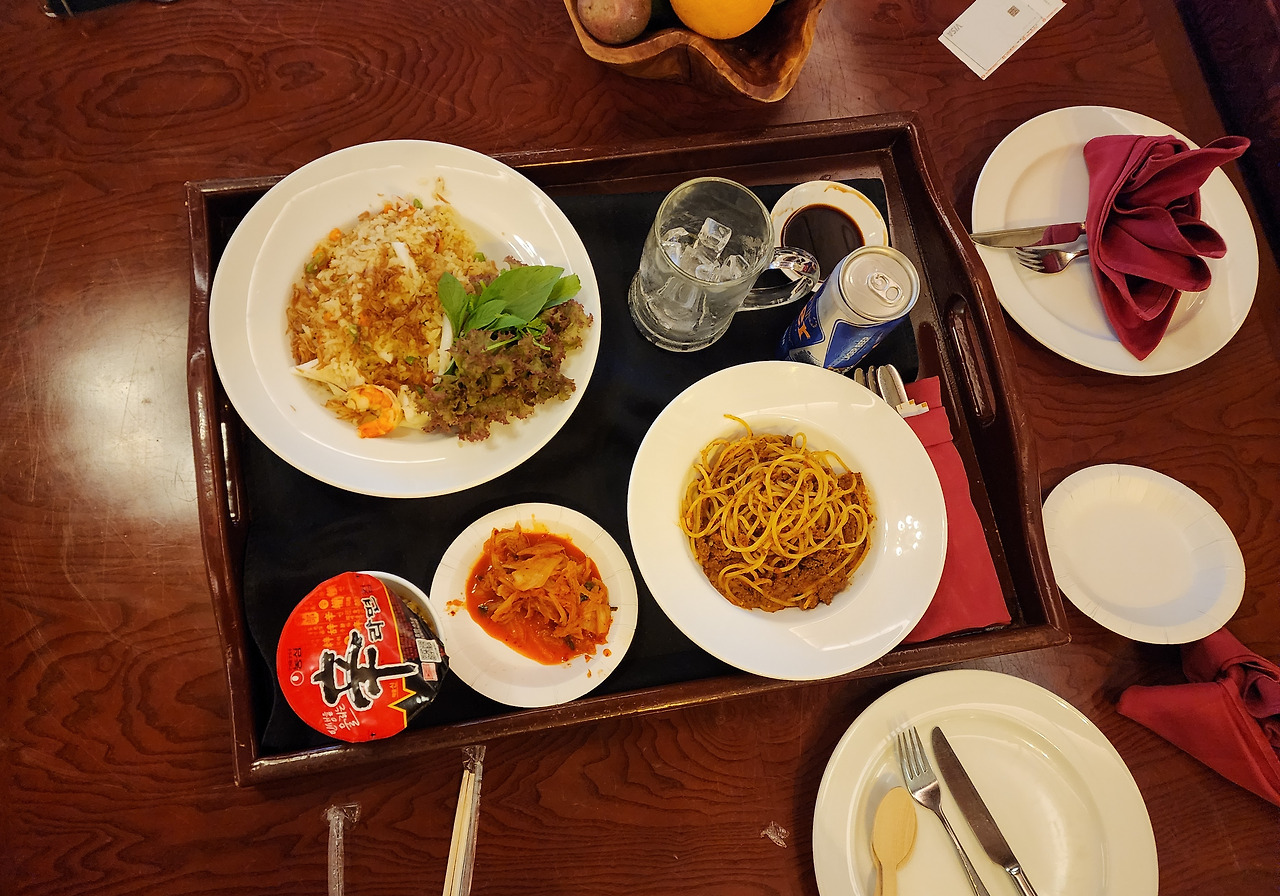 그리고 꼭 라면 국물이 생각나는 저녁 식사 / 야식 타임이 다가왔다. 그리고 주문한 룸서비스 음식과 함께 롯데마트에서 구매한 컵라면을 세팅했다.