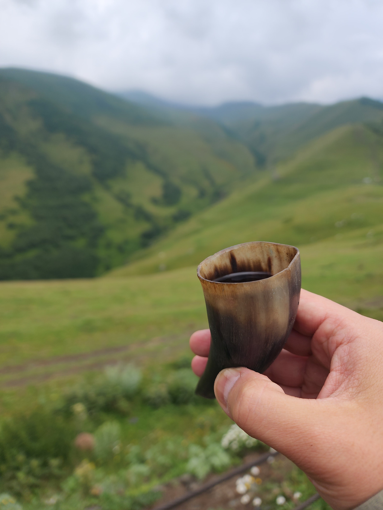 그렇게 마지막 코스인 스테판츠민다 게르게티교회 일정을 마치고, 그렇게 무뚝뚝했던 조지아 기사가 갑자기 전통잔에 술을 가득 담아주면서 한 잔 하라고 권하는 것이었습니다. 조지아 코냑인 홈메이드 차차(Chacha)를 가득 담아 Cheers를 하며, 친근감을 드러내는 것이었습니다. 아, 기사네 집에서 직접 양조했다는 차차는 최소 50도가 넘는 것처럼 느껴지는 엄청난 독주였습니다.