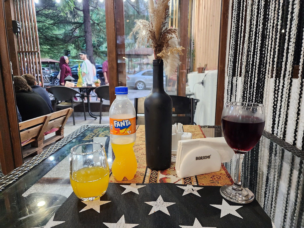 그리고 아래 사진은 조지아의 온천 휴양지 보르조미의 한 식당인데요. 거기서 주문한 하우스와인 한 잔입니다. 와, 와인 양이 보이시나요? 정말 와인마저도 가득 채워주는 인심이 끝내줬습니다.