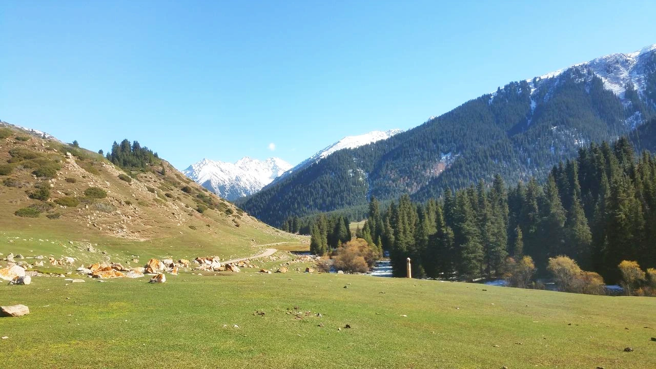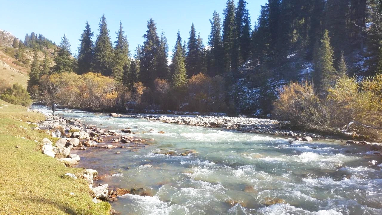 만추가경(晩秋佳景), 늦가을의 아름다운 경치라는 뜻의 사자성어가 떠오른다. 프셰발스키 박물관처럼 흩뿌려진 낙엽은 없었다. 왜냐하면 이곳은 침엽수림 지대였기 때문이다. 그렇지만, 산 위에 수채화 물감이 그라데이션처럼 뿌려진 것처럼 초록색과 노란색이 뒤섞인 산 중턱의 초원이 인상적이다. 중앙아시아 지역은 가을 기간이 아주 짧다. 그래서 10월이면 이미 우리나라의 늦가을과 같은 정취를 풍긴다. 침엽수림의 짙은 초록색과 대비되는 덜 녹은 눈과 올 한 해 수명이 다해가는 풀. 이것이다, 키르기즈스탄의 만추가경이. 시원한 계곡물 소리와 함께 말과 양이 뛰어놀고 있는 것과 같은 풍경이다.