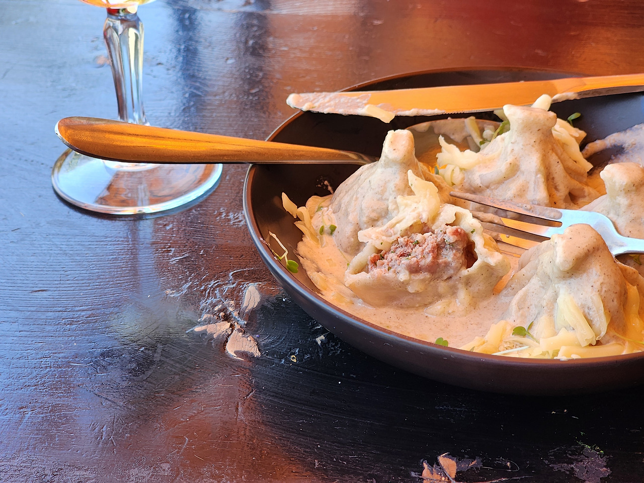 언제 주방이 준비될지 모르겠다고 하더니, 영업시간 시작 후 15분 정도만에 대략 세팅이 다 됐네요. 다른 식당에 가는 것도 귀찮아 결국 치즈와 버섯소스 가득한 미니 힌칼리를 주문하기에 이르렀습니다. 한국에서와 다르게 이렇게 시간차로 3개의 메뉴를 순차적으로 시켜본 것은 또 처음이었습니다.