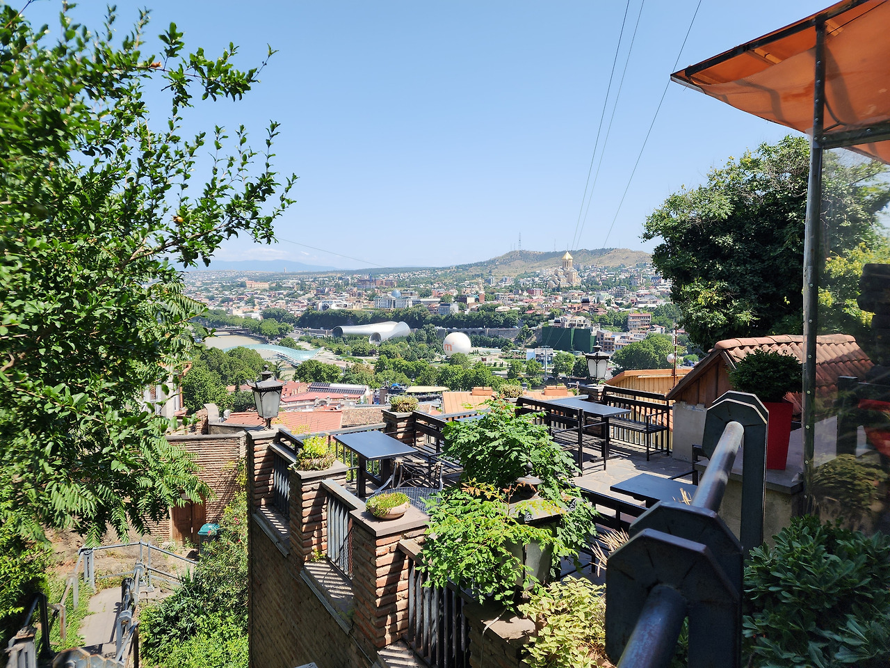 그런데, 문제가 있었습니다. 7월 말 트빌리시의 무더위였죠. 입국했던 전날 밤에는 그래도 바람이 많이 불어 엄청 덥다는 생각이 안 들었는데, 땡볕을 그대로 쬐면서 걷자 땀이 비 오듯이 쏟아지기 시작했습니다. 그래도 가까운 곳에 전망이 끝내준다는 카페 겸 식당이 있다고 해서 방문했습니다.