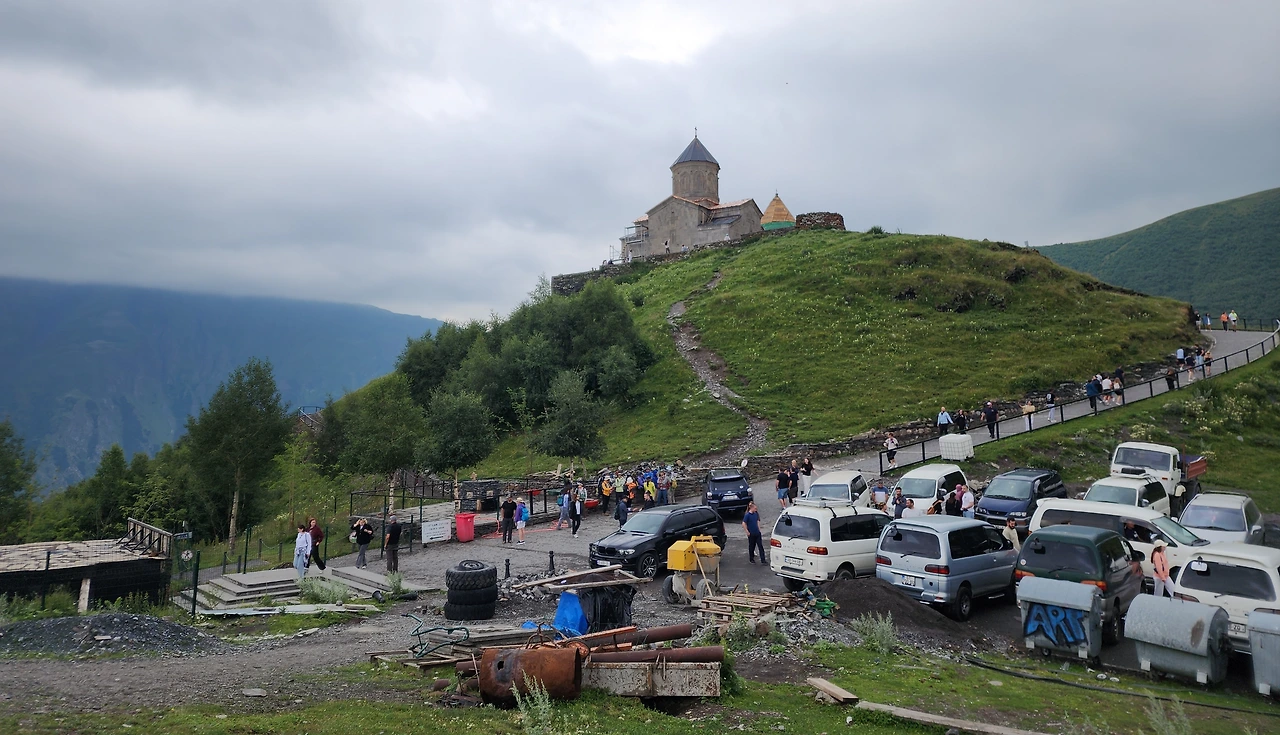보통 투어로 카즈베기를 방문하면 구다우리 등을 먼저 들렀다가 꼭 마지막에 게르게티 교회에 방문하는데요. 도착했던 시각은 약 오후 5시 무렵으로 이 날 카즈베기 투어를 하는 모든 차량이 이곳에 집합했다고 해도 과언이 아닐 정도로 많은 차량이 있었습니다.