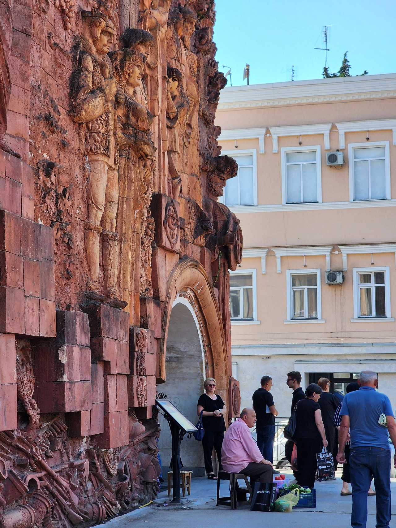 지도를 따라가다 보니 금세 시장 입구에 도착했습니다. 그런데, 도착하자마자 깜짝 놀랐는데요. 전혀 예상치 못한 예술 작품처럼 보이는 구리로 만든 '벽 부조(Relief)'가 설치되어 있었습니다. 이는 노동의 숭고함을 상징하는 구소련 시절 제작된 부조입니다.