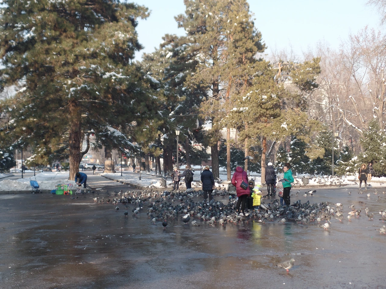 수 십 cm의 눈이 내렸다가 겨울 햇살을 맞으며 녹고 있던 12월 어느 주말. 나와 동욱이, 가영이와 희재 4인방은 여러 가지 복잡하고 미묘한 감정을 품은 상태로 학교와 가까운 알마티의 판필로프 공원으로 향했다. 이곳을 선택한 이유는 딱히 없다. 그냥 한 발자국씩 앞으로 가다 보니 자연스레 자주 가던 길로 왔더니 여기였다. 걸어서 질료니 바자르를 가기 위해서는 늘 지나갔던 곳. 비둘기 먹이를 주고 있는 사람들에게 눈길이 가는 찰나, 갑자기한 거리의 노(老) 음악가가 우리를 불러 세운다.