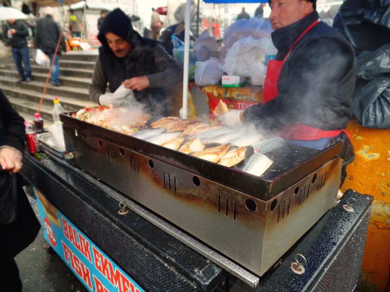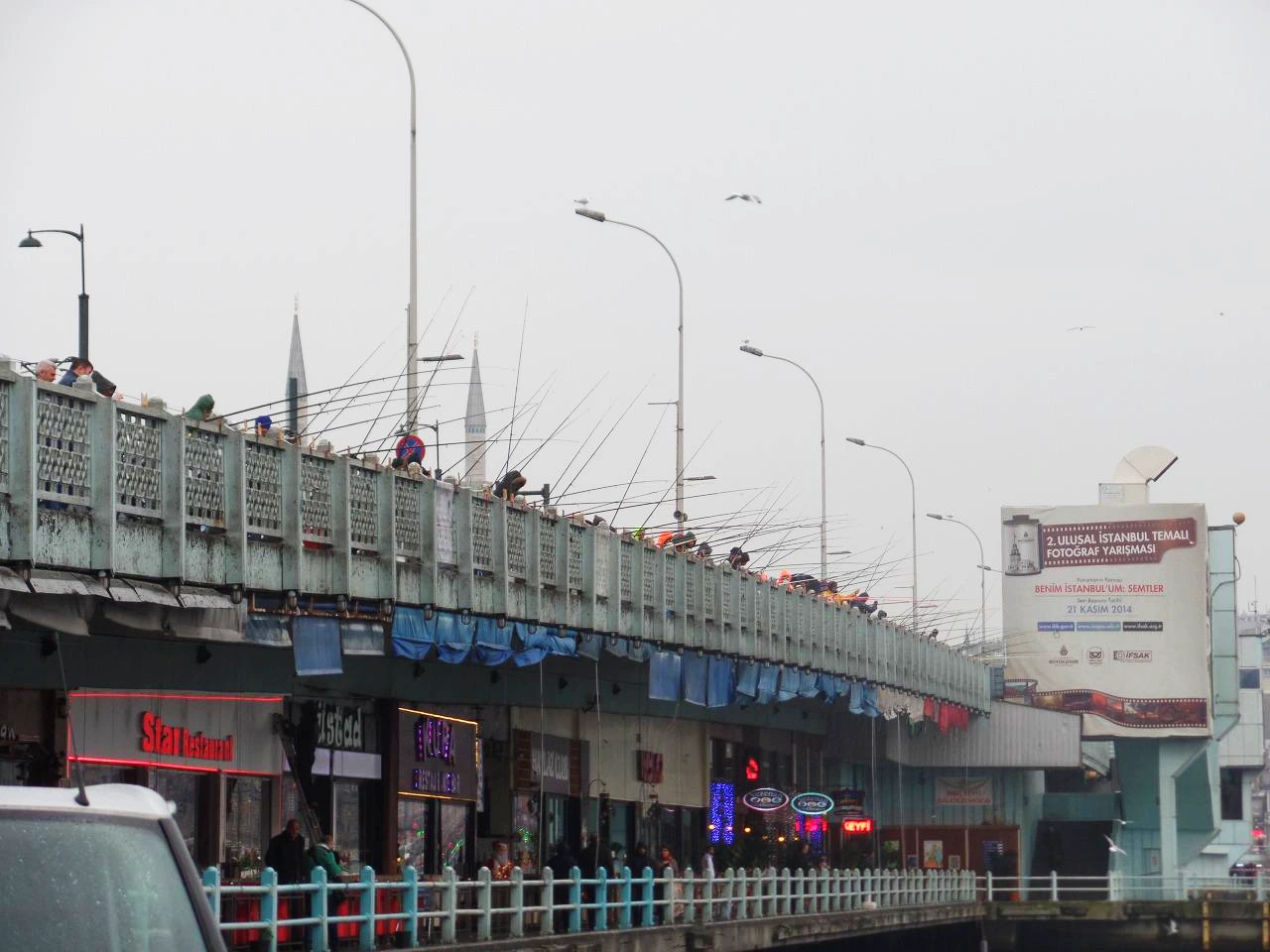 비를 맞고 거리를 돌아다니고 있노라니 금방 공복이 찾아왔다. 갈라타 타워는 꽤 높은 고지대에 있었다. 타워에서 봤던 보스포루스 해협을 가로지르는 다리가 우리의 목표였다. 그곳에 케밥집이 있을 지어니. 그렇게 한참을 걸어 내려오니 멀리 다리가 보인다. 거기서 보이는 것은 다리를 꽉 채운 사람들. 궁금증을 자아냈다. 가까이 가보니 모두가 낚시를 하고 있었다. 알고 보니 이 사람들은 그 자리에서 고등어를 낚아 고등어 케밥 가게에 생선을 공급하는 강태공들이라고 한다. 응?? 이렇게 경쟁률이 치열한데, 과연 이걸로 먹고살 수 있는 것일까? 오직 이스탄불에서만 볼 수 있는 풍경이다. 이렇게 추운 날에 도심 한복판에서 낚시라니, 이것도 보스포루스 해협이 이스탄불 시내 가운데를 관통하니까 그런 것이겠지. 그래도 어획량이 적으면 사람이 모여 있진 않았겠지? 이런 좁은 해협에 매일 단순한 낚시로도 어마 무시한 양의 고등어가 잡힌다는 사실이 믿기질 않는다. 이놈들은 흑해에서 왔을까? 아니면 마르마라 바다에서 왔을까?