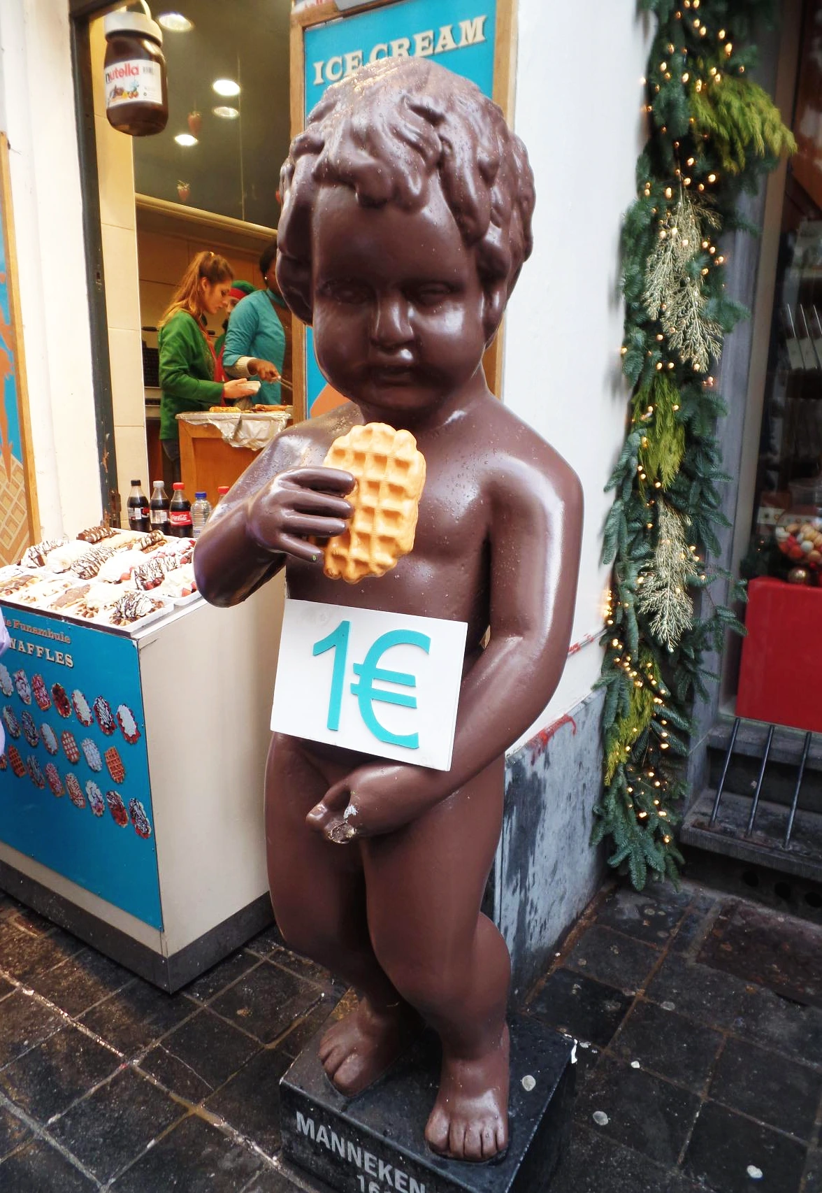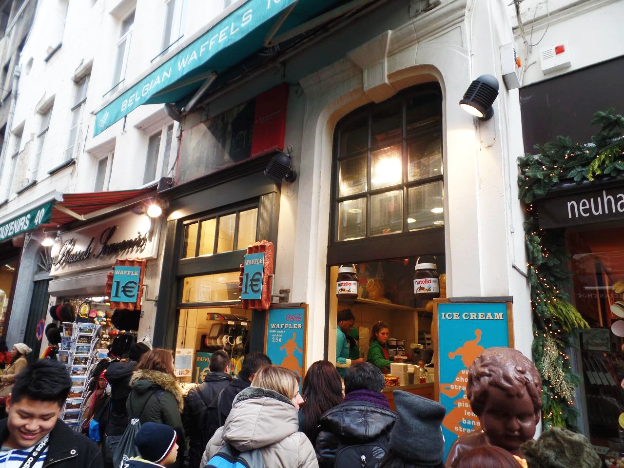그리고 동상 옆에는 1€ 부터 시작하는 와플 가게가 있었다. 일명 '오줌싸개 와플 가게'이다. 아래 문단의 사진과 같이 옆에는 오줌싸개 소년이 한 손으로는 지리고 있고, 반대 손으로는 와플을 들고 있다. 그리고 와플을 먹기 전까지는 몰랐다, 이것이 바로 내 인생에서 가장 맛있었던 와플이 됐을 것이라고 말이다. 물가 비싼 유럽에서 단돈 1€에 그 유명한 벨기에 와플을 먹을 수 있다는 사실 하나만으로도 너무 설렜다. 마침 빠에야를 배불리 먹었다고 생각했지만, 금방 배가 꺼지던 찰나에 발견한 기회였다. Display 되어 있는 와플이 너무 맛있어 보인다. 본래 나는 크림이 들어간 음식은 그 느끼함이 싫어서 질식하는데, 이것은 달라 보였다. 적당히 달콤한 설탕과 크림 냄새, 그리고 상큼한 과일향이 줄을 서있는 멀리까지 느껴질 정도였으니 말이다. 이곳은 추측컨데 한 가족이 운영하는 가게 같았다. '티끌 모아 태산'이라는 말처럼 1€씩 싹싹 돈을 긁어서 버는 것 같다는 생각이 들었다. 5~6살 정도로 보이는 남자아이도 호객행위를 하고 있었는데, 돈맛을 아는 것인가 보통내기가 아니었다. 일단 이곳이 맛집인지 판단이 서지 않기 때문에 우리는 각자 1€ 와플 하나씩 총 세 개를 주문했다. 겨울에 먹는 뜨끈뜨끈하고 달달한 와플이라니, 너무 기대된다.