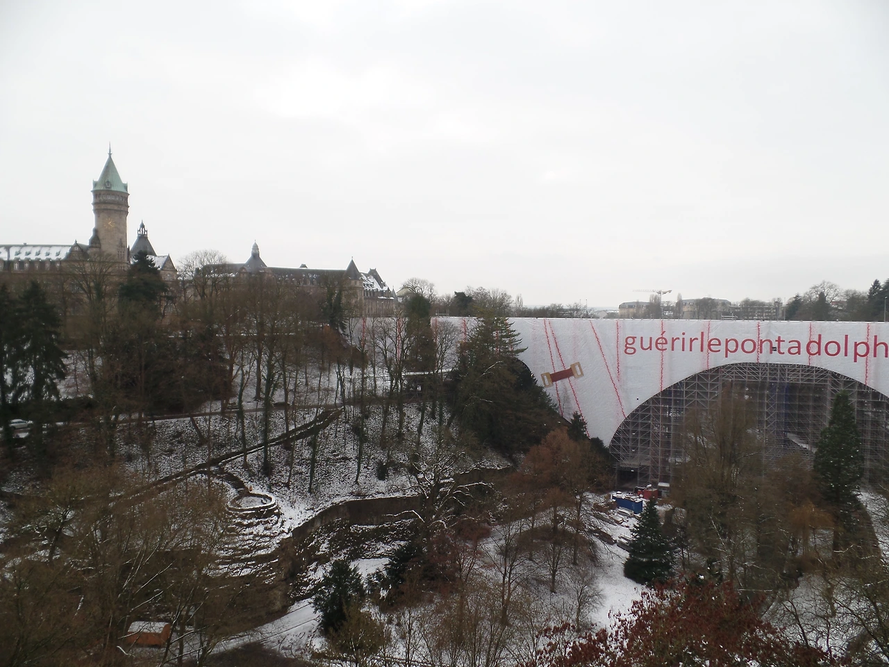 그래도 아돌프 다리 전체를 조망할 수 있는 전망대에 서서 눈이 내린 도심 풍경은 아름다웠다. 약 150년 전에 어떻게 이렇게 큰 다리를 건설하였으며, 이것이 지금까지도 무너지지 않고 어떻게 안전하게 유지될 수 있었을까? 물론 요즘 우리나라의 잘 닦여진 길을 운전하다 보면 한 번씩 감탄사를 내뱉지만, 지금은 '현대'이고 건설될 당시는 '근대' 시대가 아닌가! 무려 높이 46m에 길이는 153m이고 석재로 지어진 다리, 게다가 이는 일반 다리도 아니고 '아치형(Arch)'이었다. 높이가 상당히 높아 일반적인 디자인의 다리로 건설해도 난이도가 상당히 높을 것 같은데, 아치형이라니. 다시 글을 쓰면서 사진으로 봐도 놀라울 따름이다. 지어질 당시 세계에서 가장 큰 아치교였다고 한다. 공사기간은 1889년 ~ 1903년까지로 무려 15년에 걸쳐서 완공됐다. 무조건 빨리빨리만 추구하는 우리나라를 비롯한 몇몇 국가에 어찌 보면 이 오래된 다리가 하나의 시사점이 될 수 있지 않나 생각한다. 원래는 다리를 건너 반대편까지 걸어서 가려고 했는데, 공사 중으로 길이 막혀 조금 당황스럽다. 그렇다면, 역시 발길 닿는 대로 걸어야지.