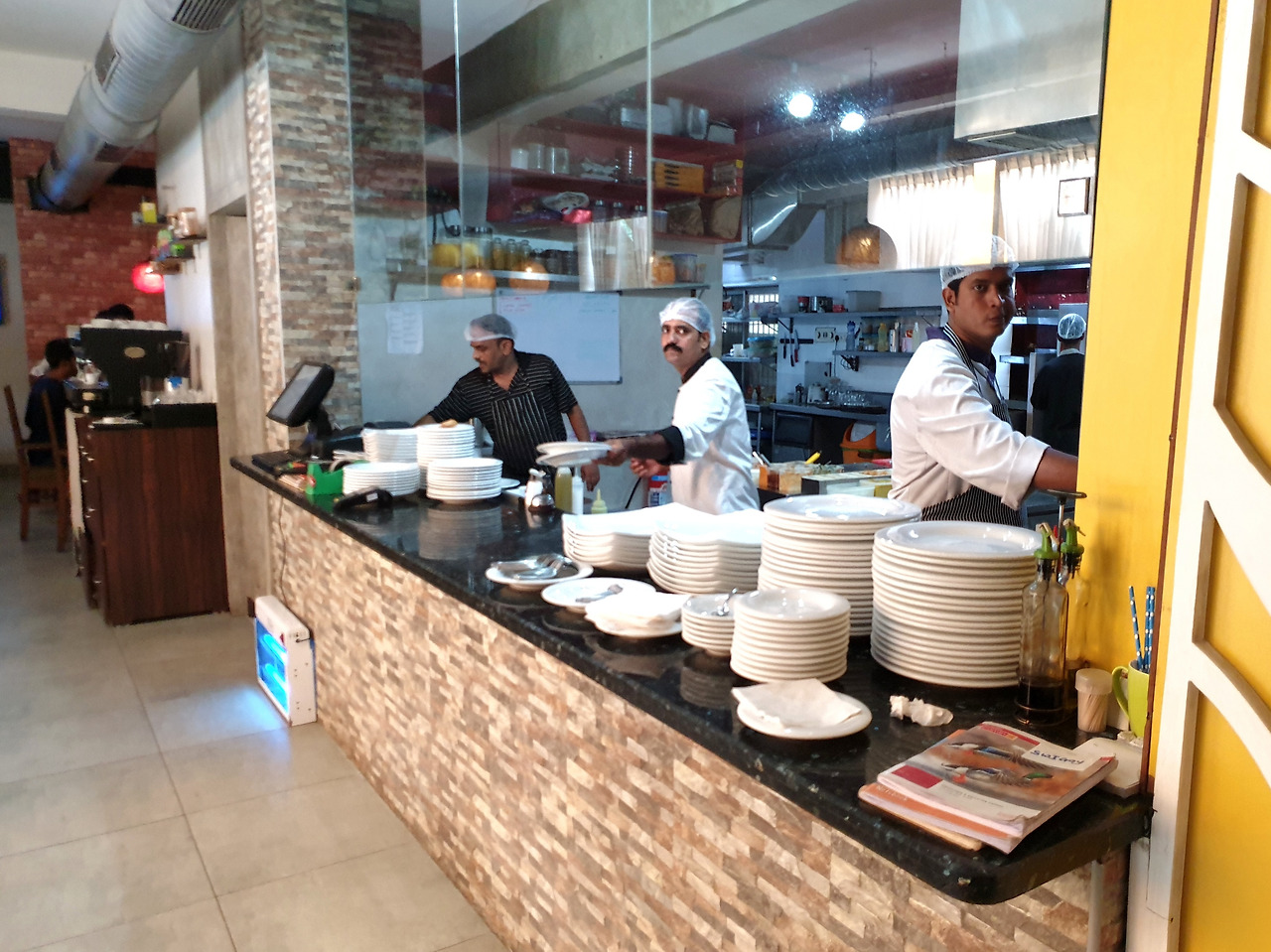 이 식당 음식의 조리는 인도 현지인들이 하지만 주인은 서양인이다. 그래도 인도스럽지 않게 다들 머리카락 안 떨어지게 머리에 무언가를 쓰고 있고, 오픈형 주방이라 상당히 위생적으로 신뢰가 가는 곳이다. 인도스럽지 않게 말이다. 그래서인지 한국인 첸나이(Chennai) 주재원과 그 가족들이 많이 찾아오는 것 같다.