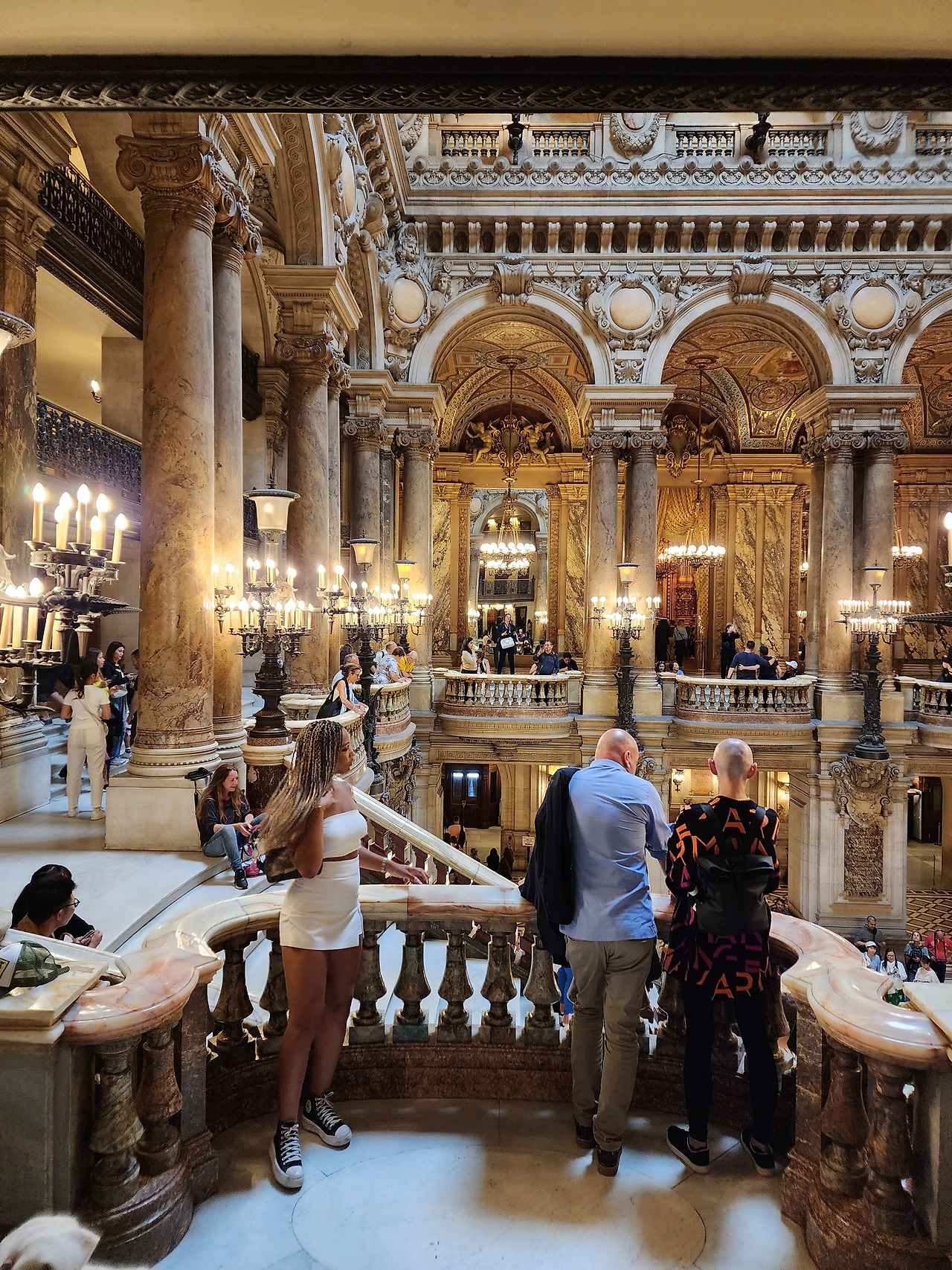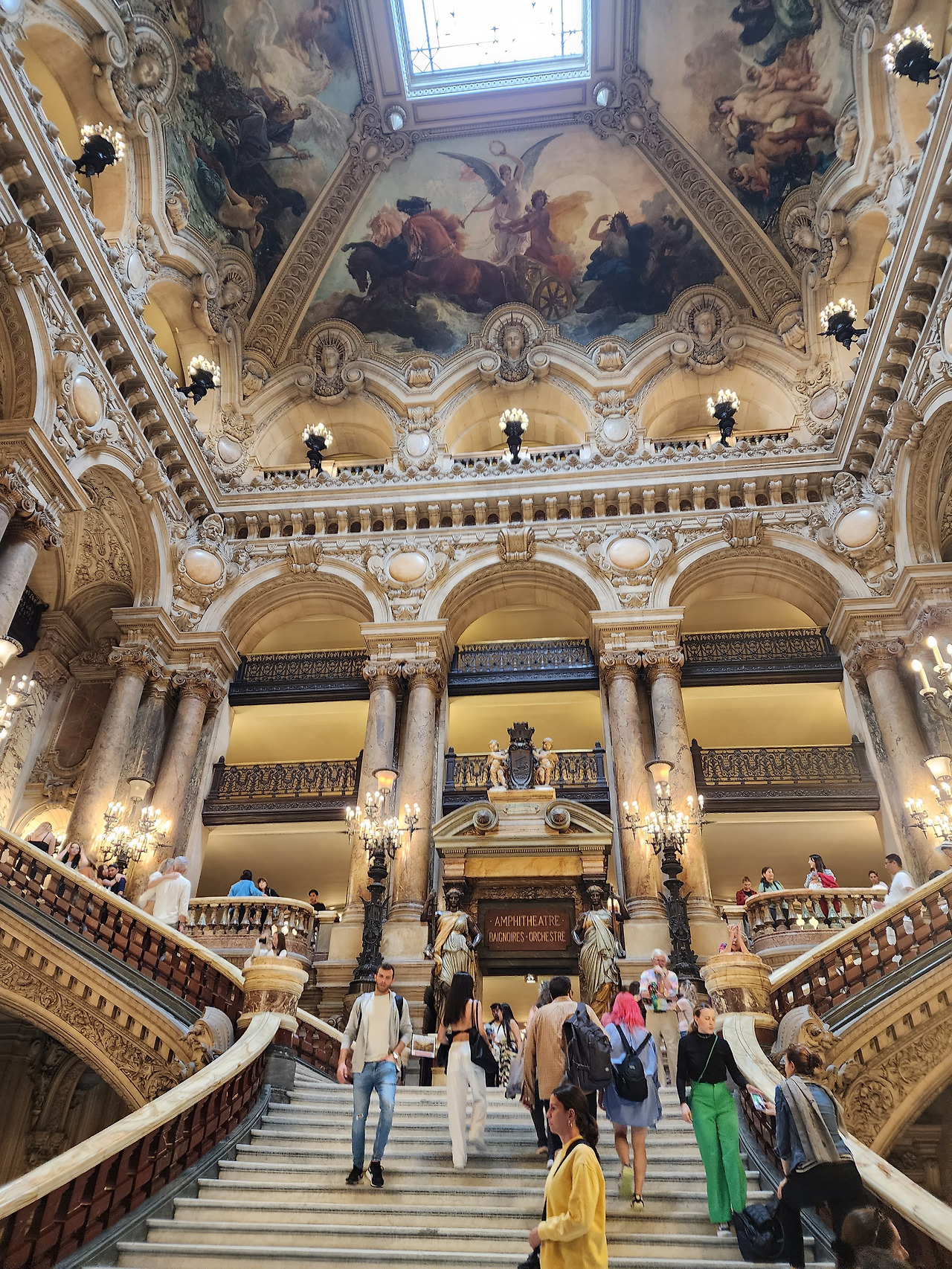 콩시에르주리와 주변에서 시간을 보내다가 예매한 티켓 시간대에 맞춰 도착한 오페라 가르니에 입구는 생각보다 붐비지 않았다. 다만, 내부로 들어가니 엄청난 관광객들이 있었는데, 안내 표지판을 따라 걸어가다 윗층으로 올라가는 계단 앞에서 그 엄청난 모습을 보고 아주 강렬한 인상을 받았다.
