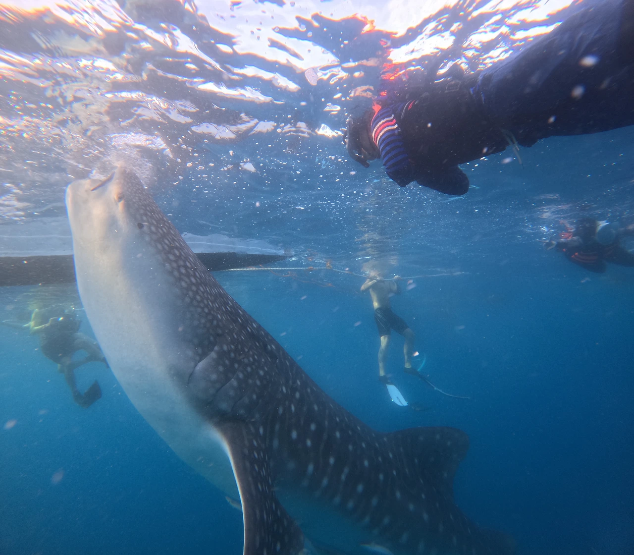 가이드 분들이 고래상어와 함께 수영했다는 인증샷을 수십 장 찍어주시는데, 고래 세 마리에 사람은 100명쯤 몰린 상황이라 고객이 만족할 만한 사진이 나오도록 더 애를 쓰는 것 같았다.