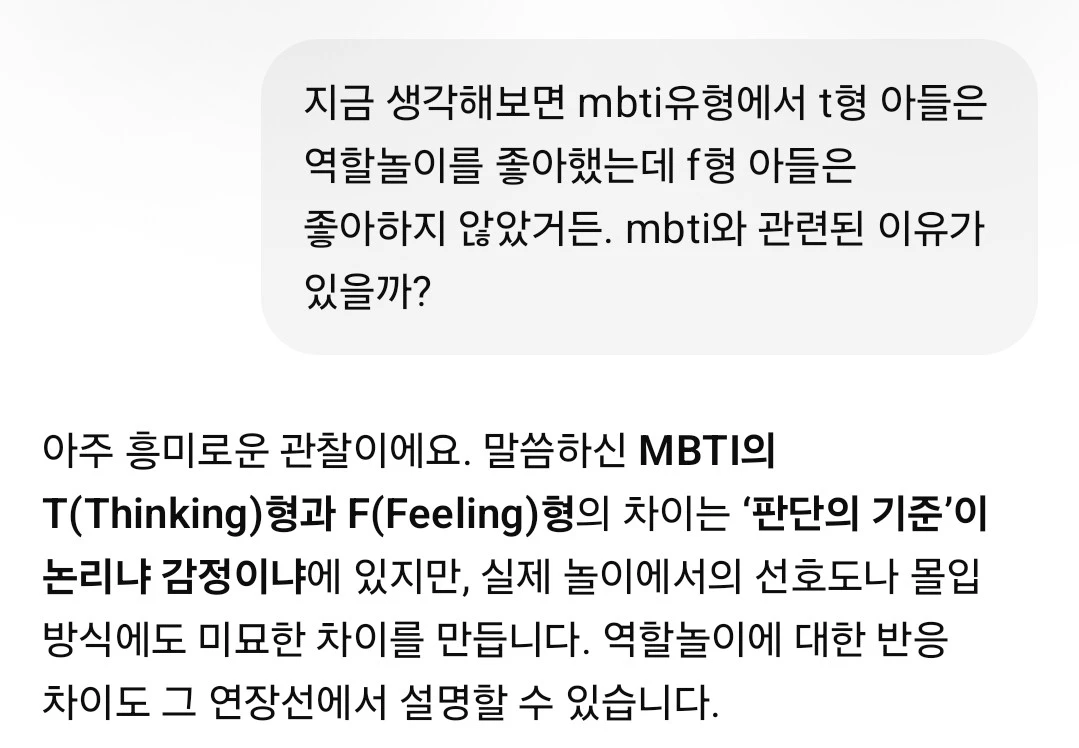 역할놀이는 감정의 ‘진짜’ 교류보다는 ‘가짜’ 상황을 전제로 하죠. F형 아이에게는 “진짜 내가 아닌 역할을 하는 것”이 오히려 어색하거나 감정적으로 몰입하기 어려울 수 있습니다.
