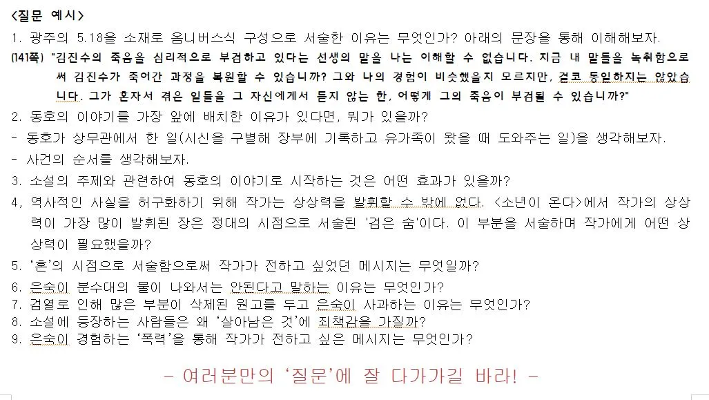 나는 이 기회에 한강의 <소년이 온다>를 아이들과 꼭 한 번 읽고 싶었다. 문학 시간에 인간의 보편적 삶을 탐구하다 보면 결국 역사의 한 단면과 맞닿을 수밖에 없어서 종종 현대사의 비극을 언급해야 하기 때문이다. 조금 비약하자면, 소설가 한강이 광주의 5.18을 쓰지 않고는 다른 무엇도 쓸 수 없었다고 말한 것과 비슷하게 이 소설을 함께 읽지 않고는 문학수업을 한 것 같지가 않은 것이다.