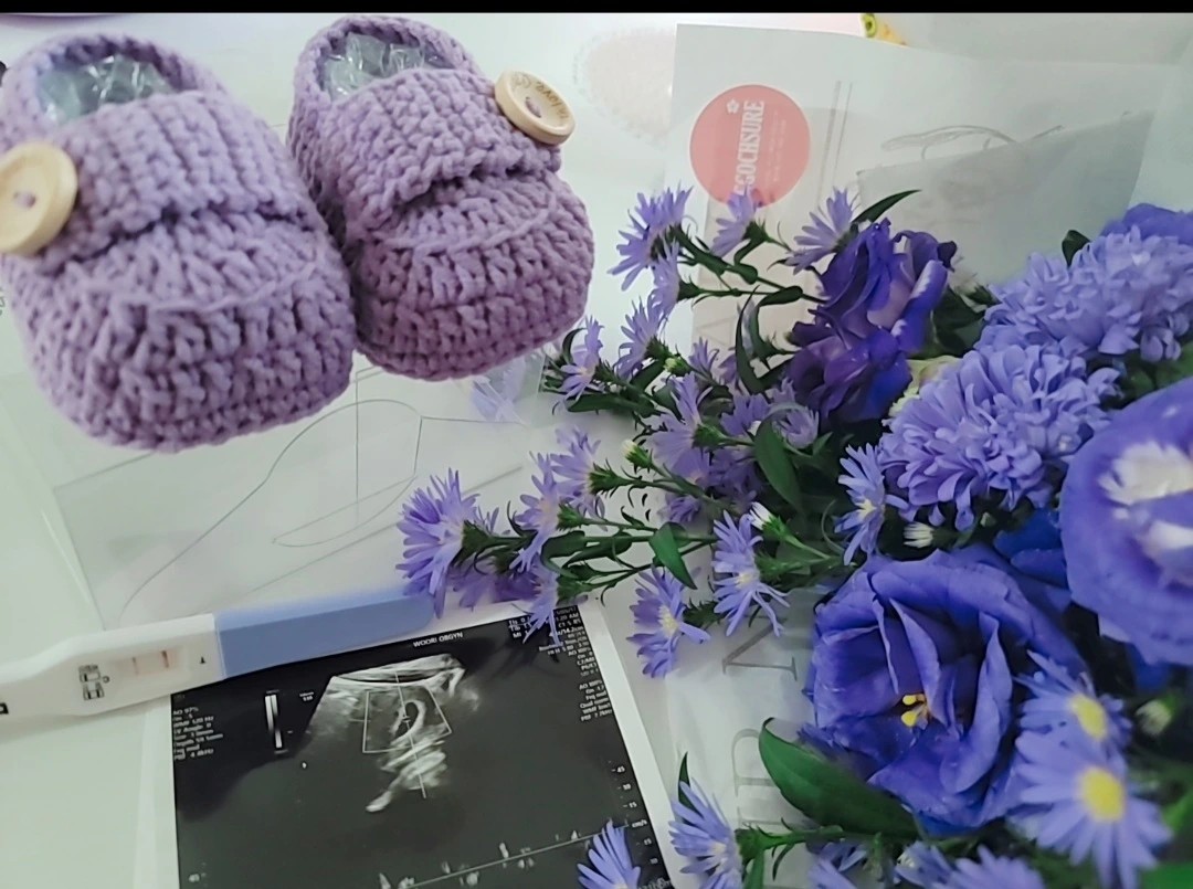 남편이 고맙다며 사온 보라색 꽃다발 + 임신테스트기 + 한 달전 제주도에서 기념으로 사온 아가신발 = 너가 나에게 온 순간“여보 그렇게 좋아?”