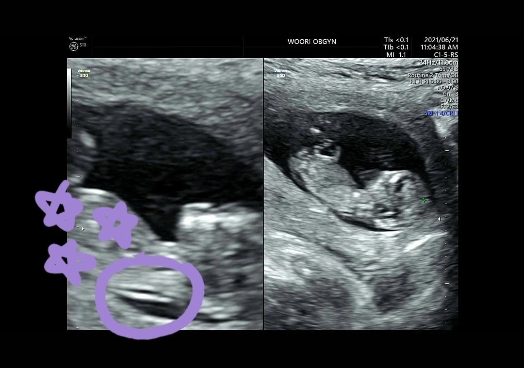 “태아의 목덜미 뒤에 있는 이 얇은 부분은 목 투명대라고 해요. 이 목 투명대는 대부분 3.0mm를 기준으로 보고 있어요. 3.0mm가 넘으면 다운증후군 가능성이 있는데 우리 아가는 1.1mm로 보이죠~ 아주 괜찮습니다.”