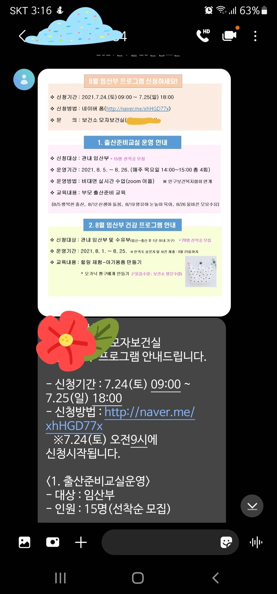 보건소에서 태교 및 출산교실에 관한 안내글이 문자로 오고있다.