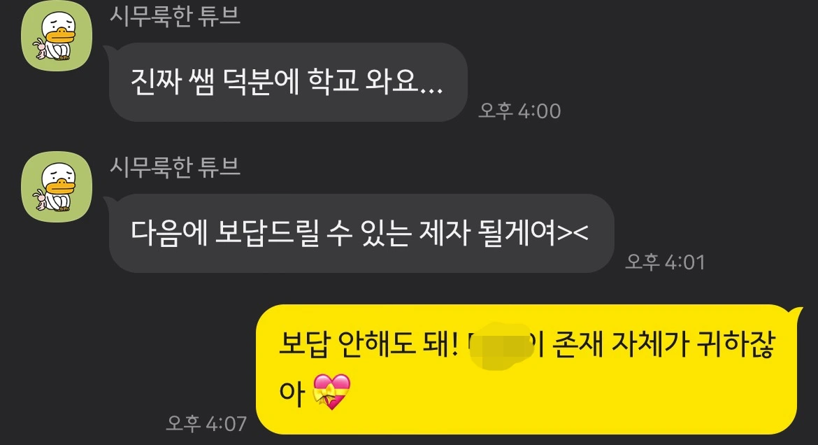 달달한 초콜릿을 좋아하는 너, 오늘은 유난히 티라미수가 먹고 싶다고 했지. 꾸덕꾸덕하며 달달한 맛을 최상으로 느낄 수 있는 케이크. 수업이 끝나자마자 너에게 케이크를 선물했어. 지금은 시험기간이라 함께 시간을 보낼 수 없지만, 중간고사만 잘 마무리하고 함께 맛있는 것을 먹으러 가자고 약속하며 말이야. 그리고 너는 나에게 말했지. 나중에 보답하도록 훌륭한 제자가 되겠다고. 내 대답처럼 보답하지 않아도 돼. 그냥 너 자체, 존재만으로도 나에게 참 소중한 존재니까. 그냥 너대로 너의 위치에서 멋지게 잘 자라달라고. 그렇게 응원하고 싶어.
